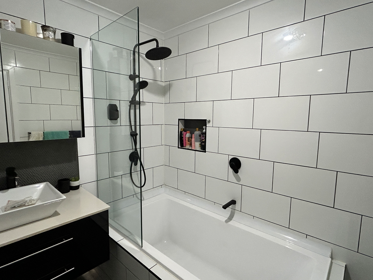 The main bathroom was updated recently and features a large bath tub with overhead shower, glass screen, basin & vanity., and fan/light/heater.