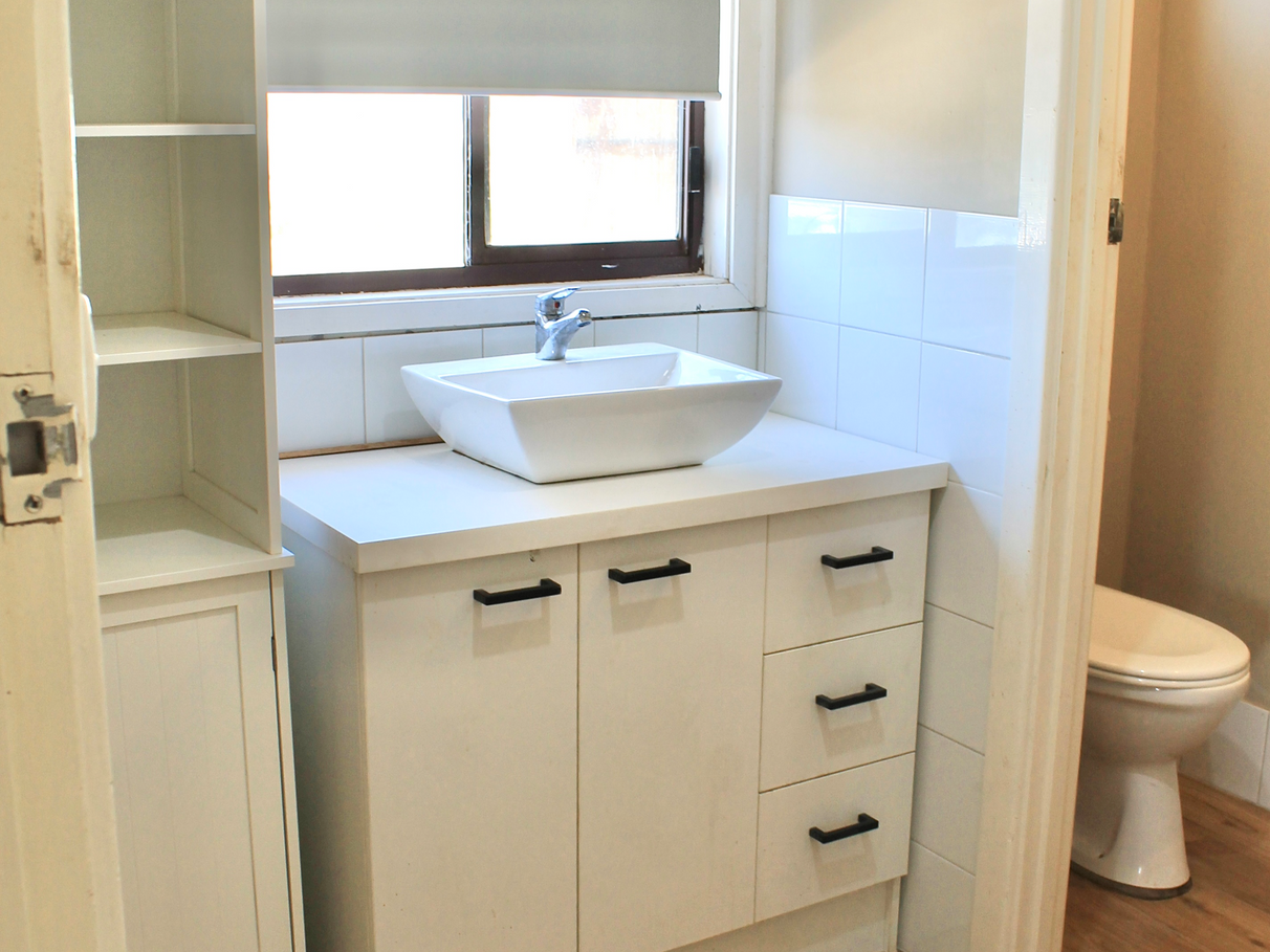 Off the eastern entrance, there is a separate toilet and wash room, with a vanity basin and storage cupboards.