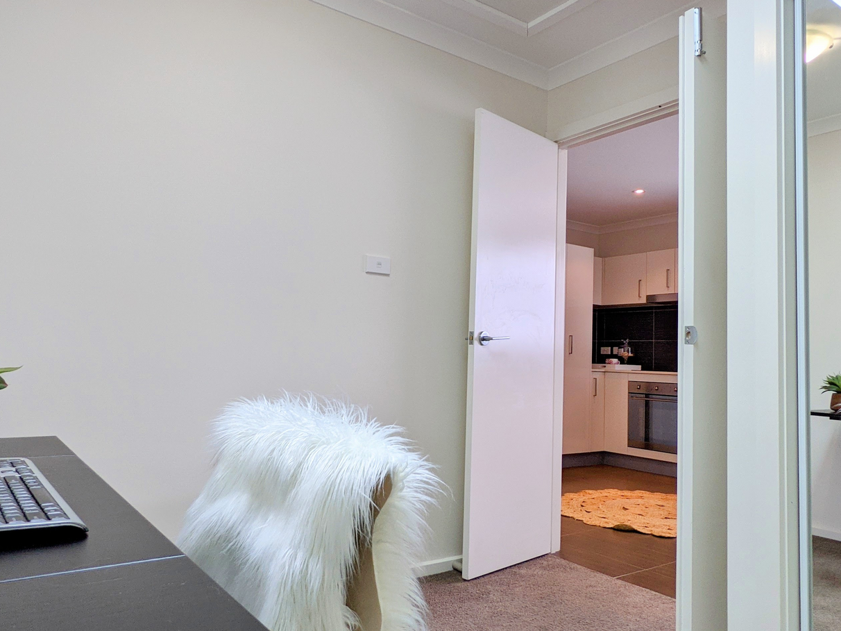 The bedrooms feature built in robes. The bathroom also houses the laundry behind bi-fold doors. The modern kitchen is open planned with the living area, and it is completed with dishwasher and electric cooking appliances.