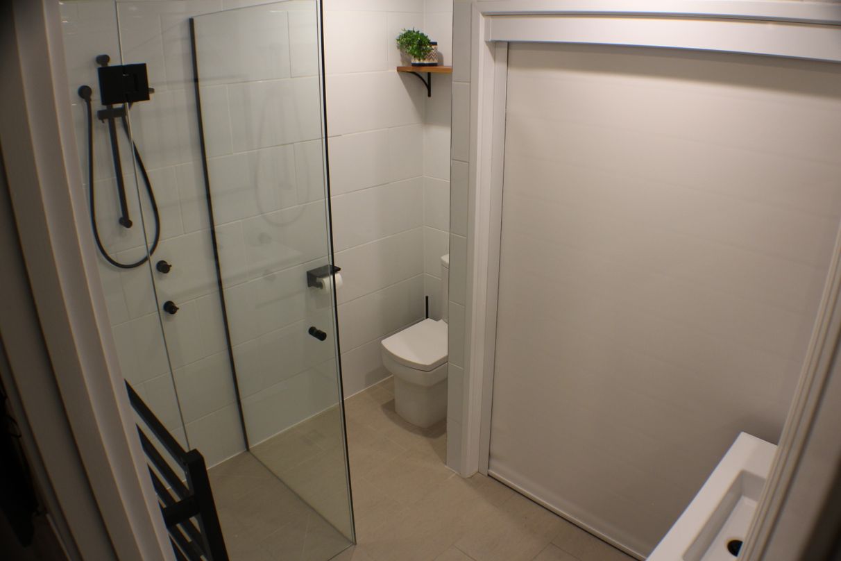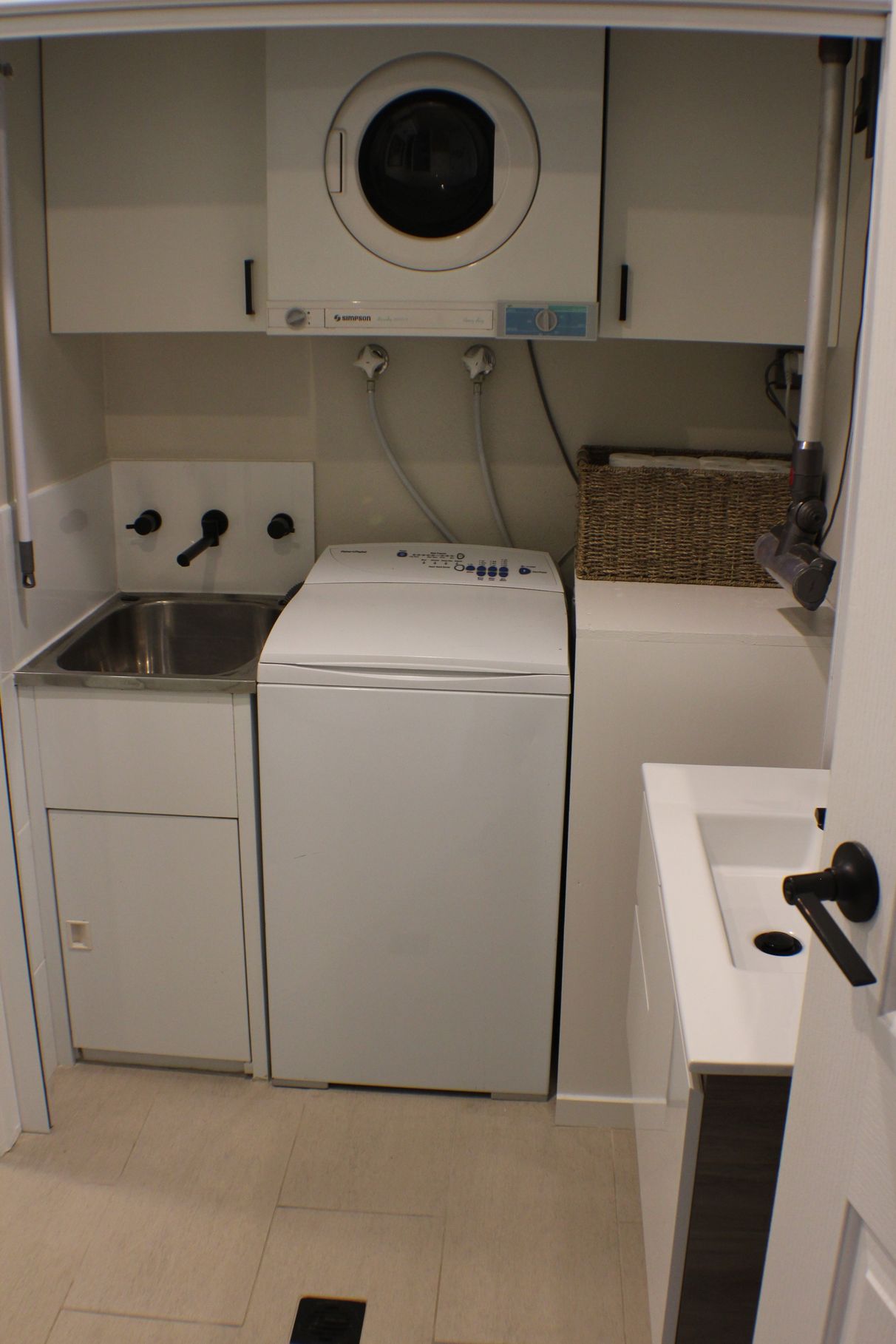 The full sized kitchen includes a Miele induction cooktop and Miele oven, double sink, subway tiled splashback plus plenty of storage space. The black tapware continues into the bathroom which compliments the crisp white floor-to-ceiling tiles, frameless shower screen and floating vanity.