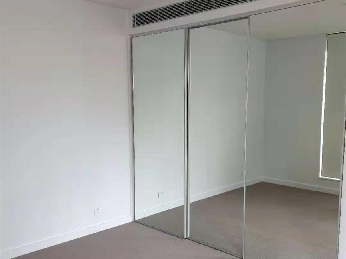 * Main bedroom with built-in wardrobe, large east-facing windows and private north-facing access to balcony