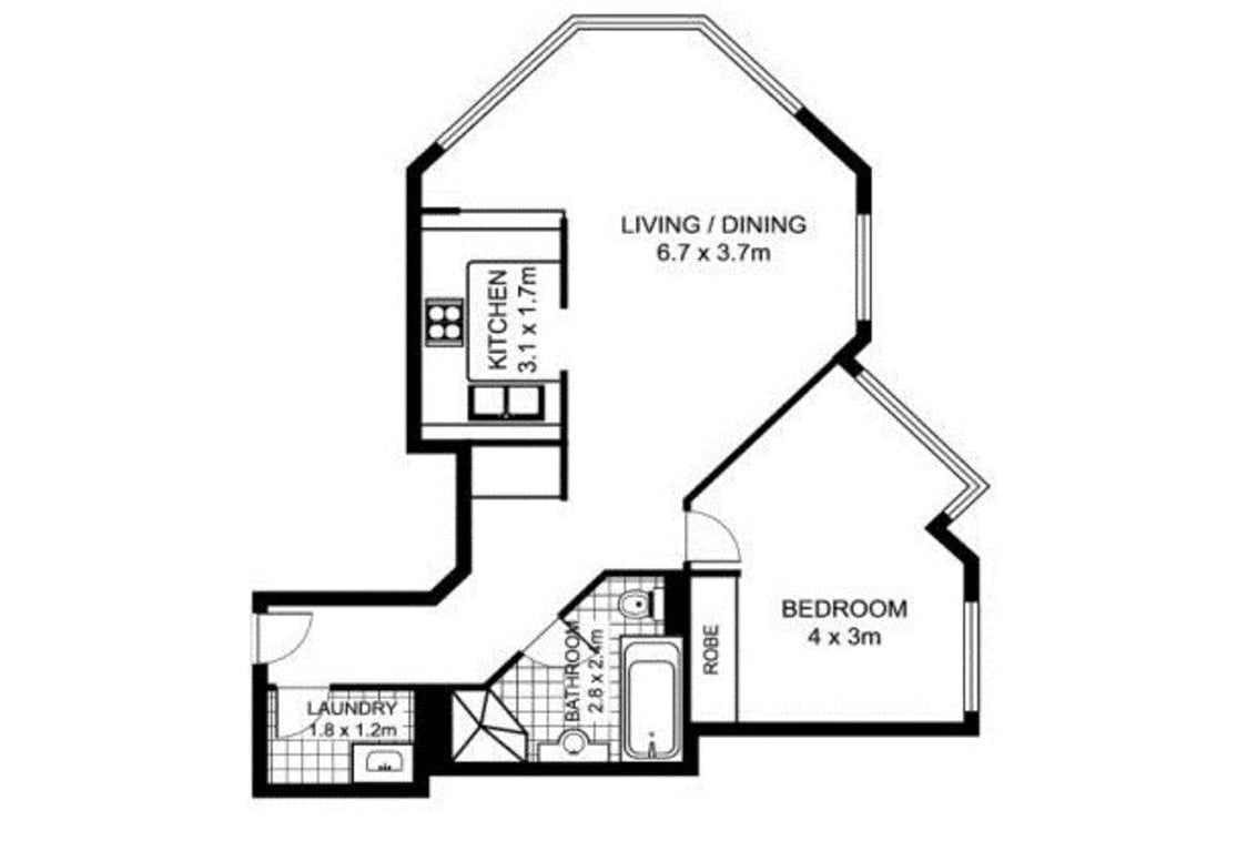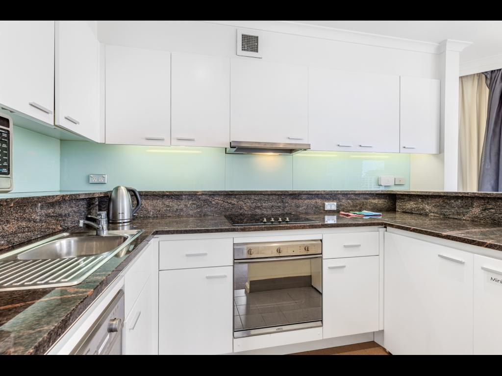 This so-comfortable one-bedroom apartment has an extensive living room and bedroom/office, quality granite kitchen, marble bathroom, separate internal laundry room, useful hallway and, best of all, sweeping views of the western harbour from the living room and bedroom, and the bustling George Street district. It's high above the city, on the quiet 19th level, and is unexpectedly big, at 64 sq m.