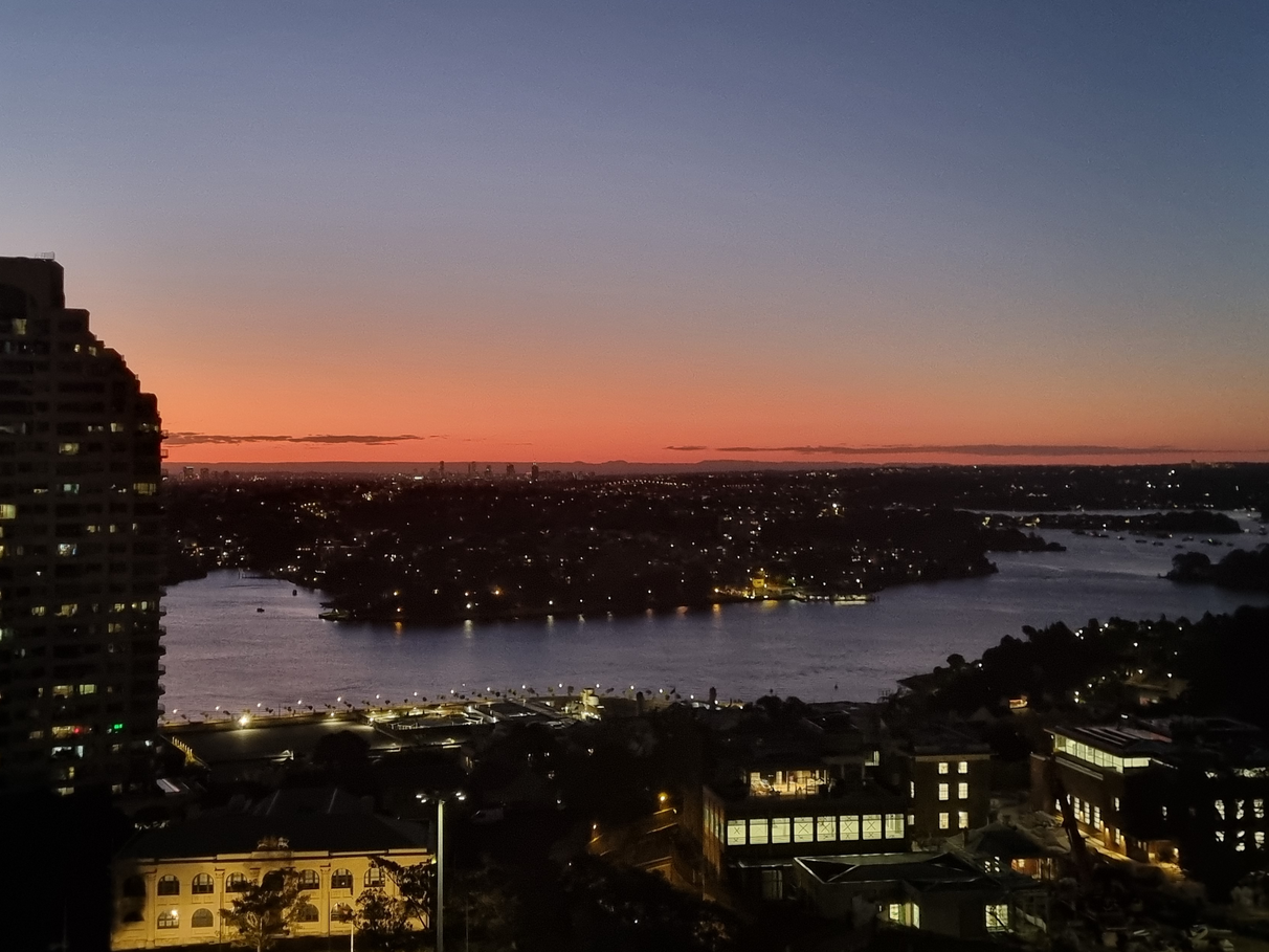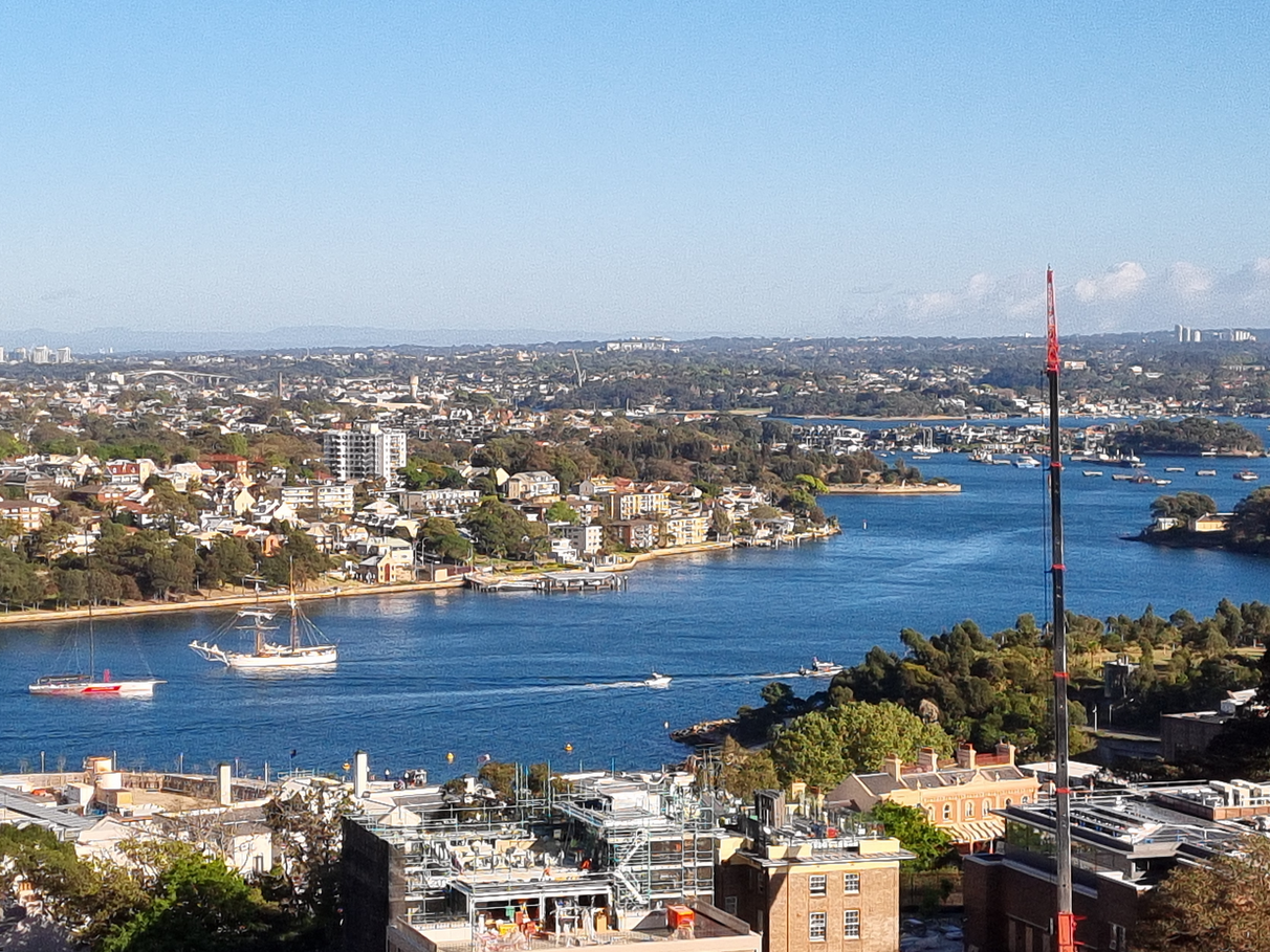 This so-comfortable one-bedroom apartment has an extensive living room and bedroom/office, quality granite kitchen, marble bathroom, separate internal laundry room, useful hallway and, best of all, sweeping views of the western harbour from the living room and bedroom, and the bustling George Street district. It's high above the city, on the quiet 19th level, and is unexpectedly big, at 64 sq m.
