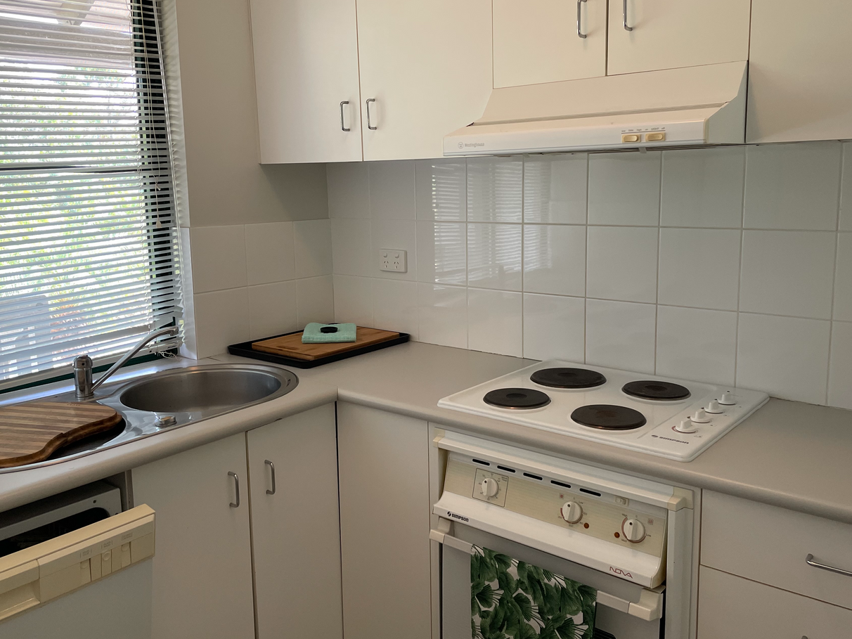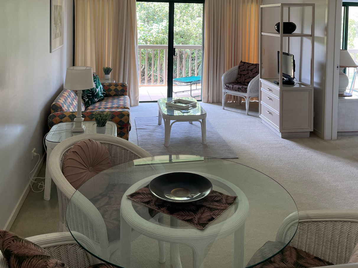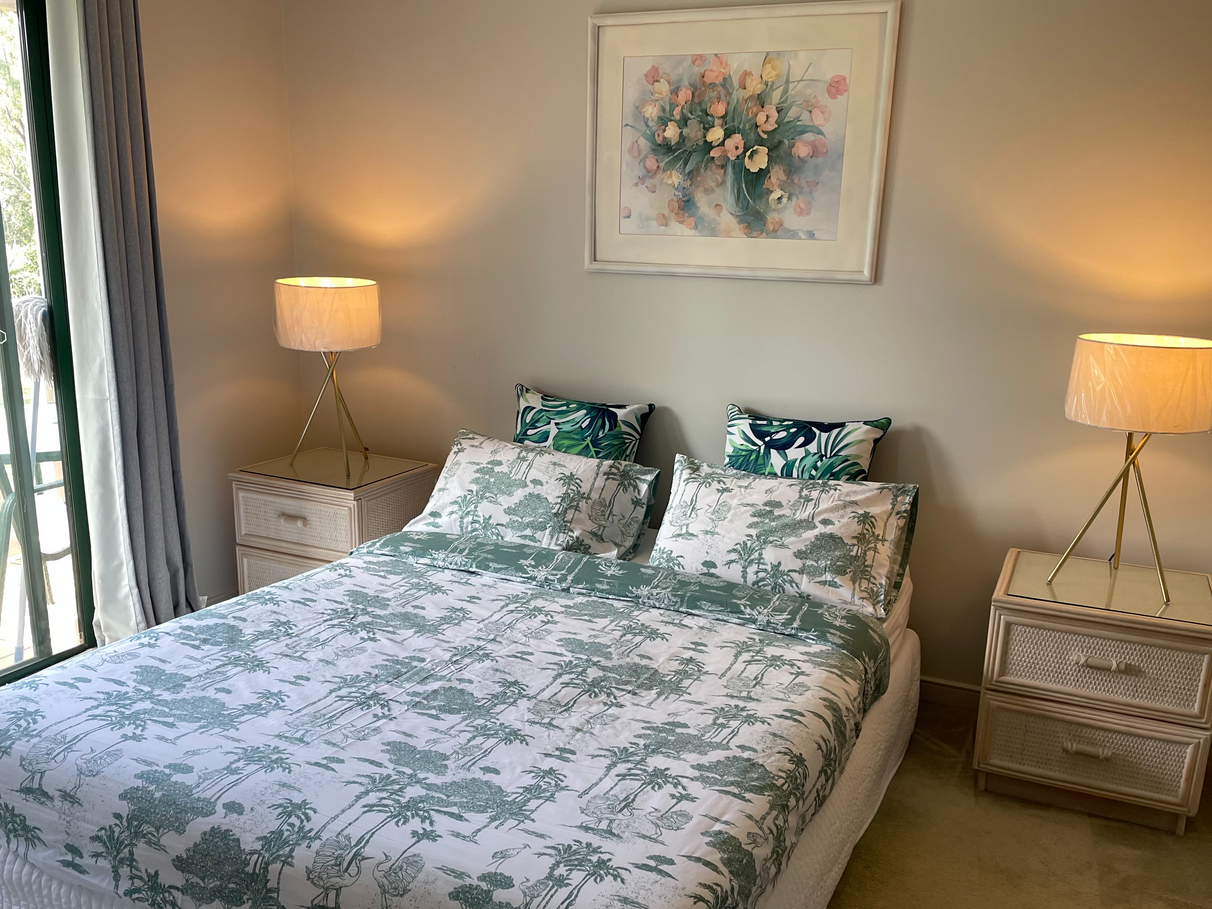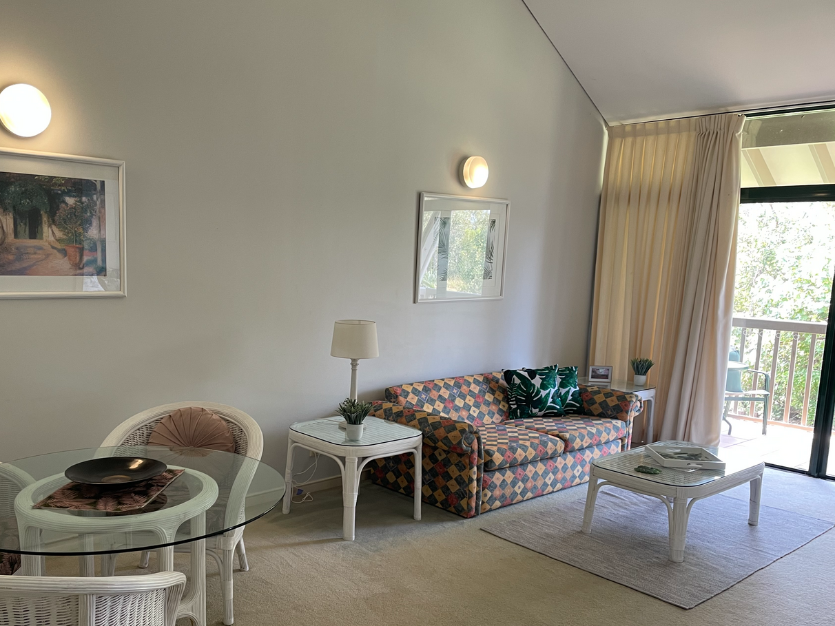 In an idyllic setting you will find this two bedroom, fully furnished first floor apartment in the Cascade Condominiums. The spacious combined lounge and dining areas spill out onto a good sized balcony, large enough for a dining setting and sunlounge. The master bedroom has direct access to the bathroom with laundry, and the toilet is separate. The space is set off by a high vaulted ceiling in the living area, giving that extra feeling of space and light.