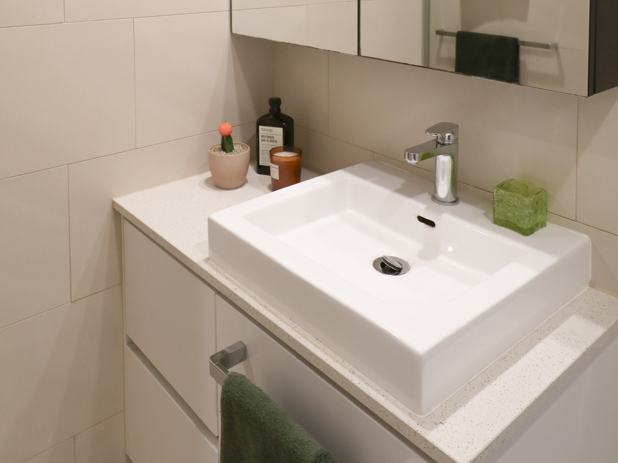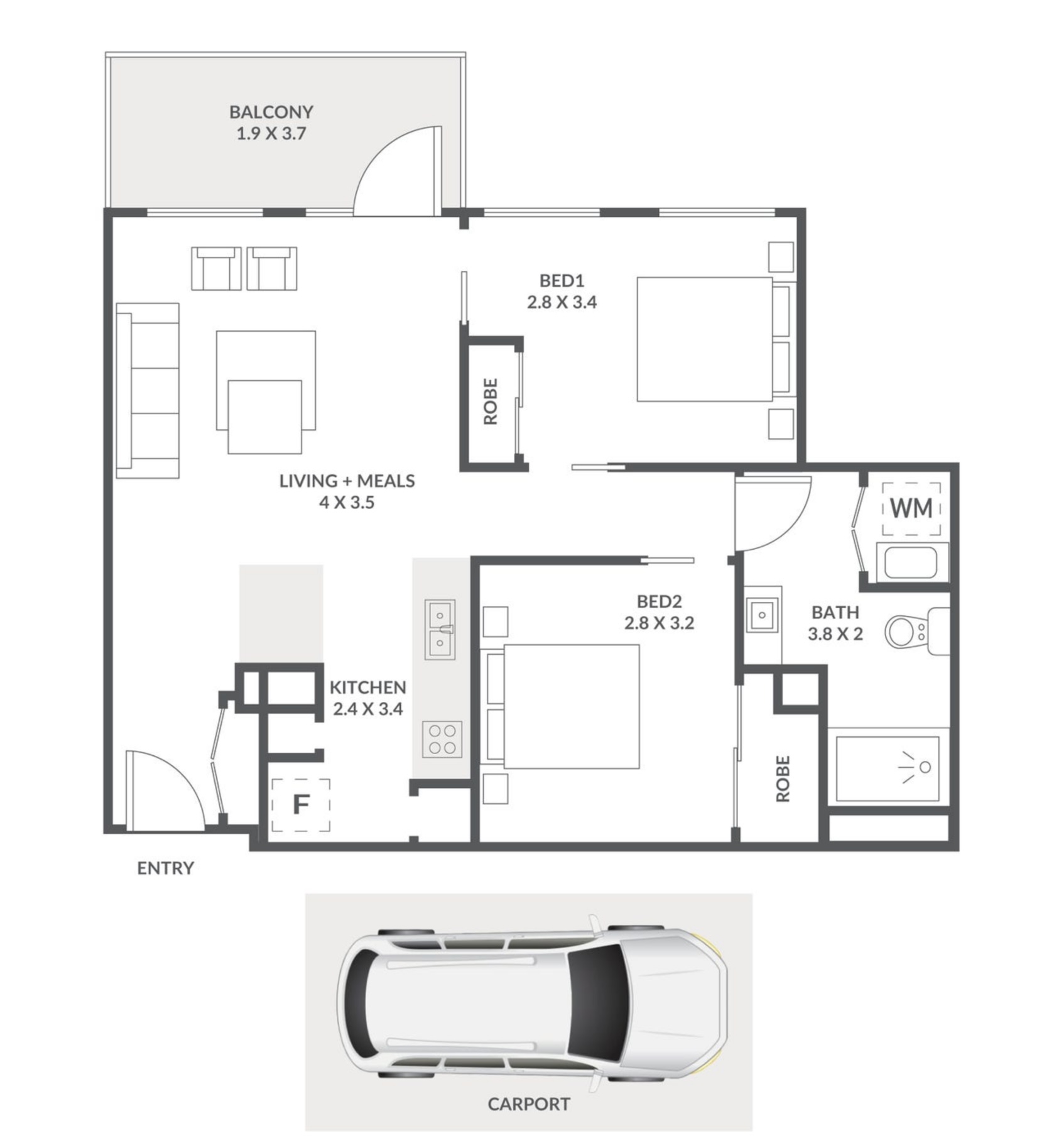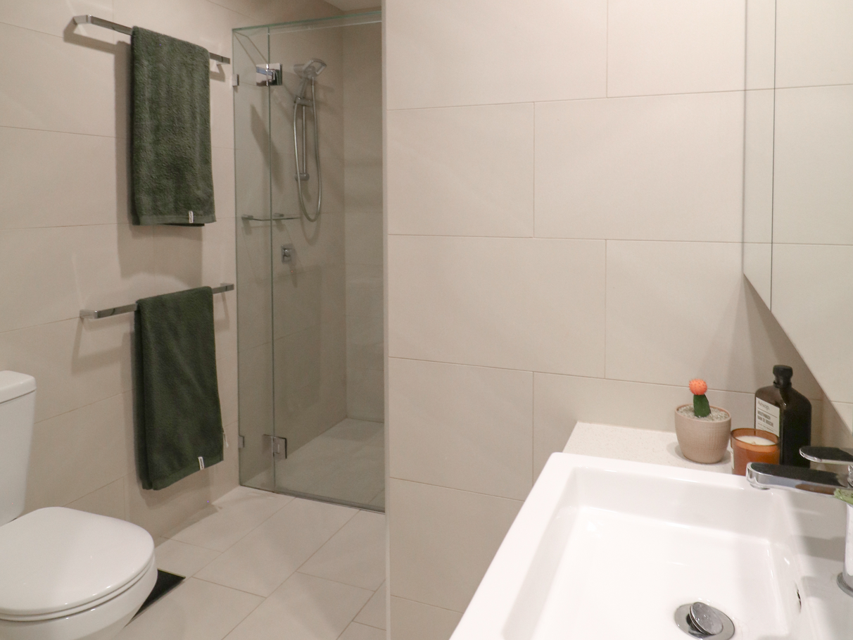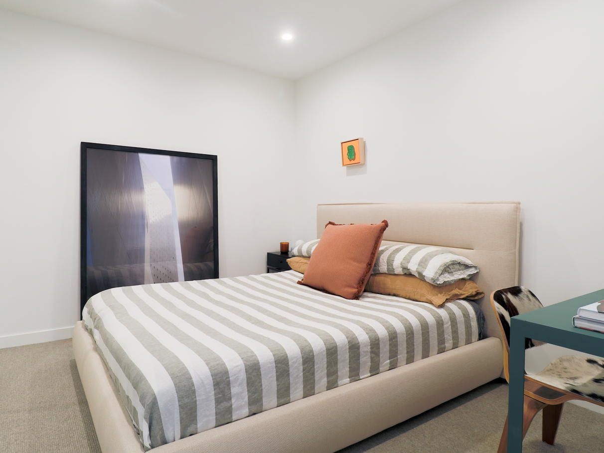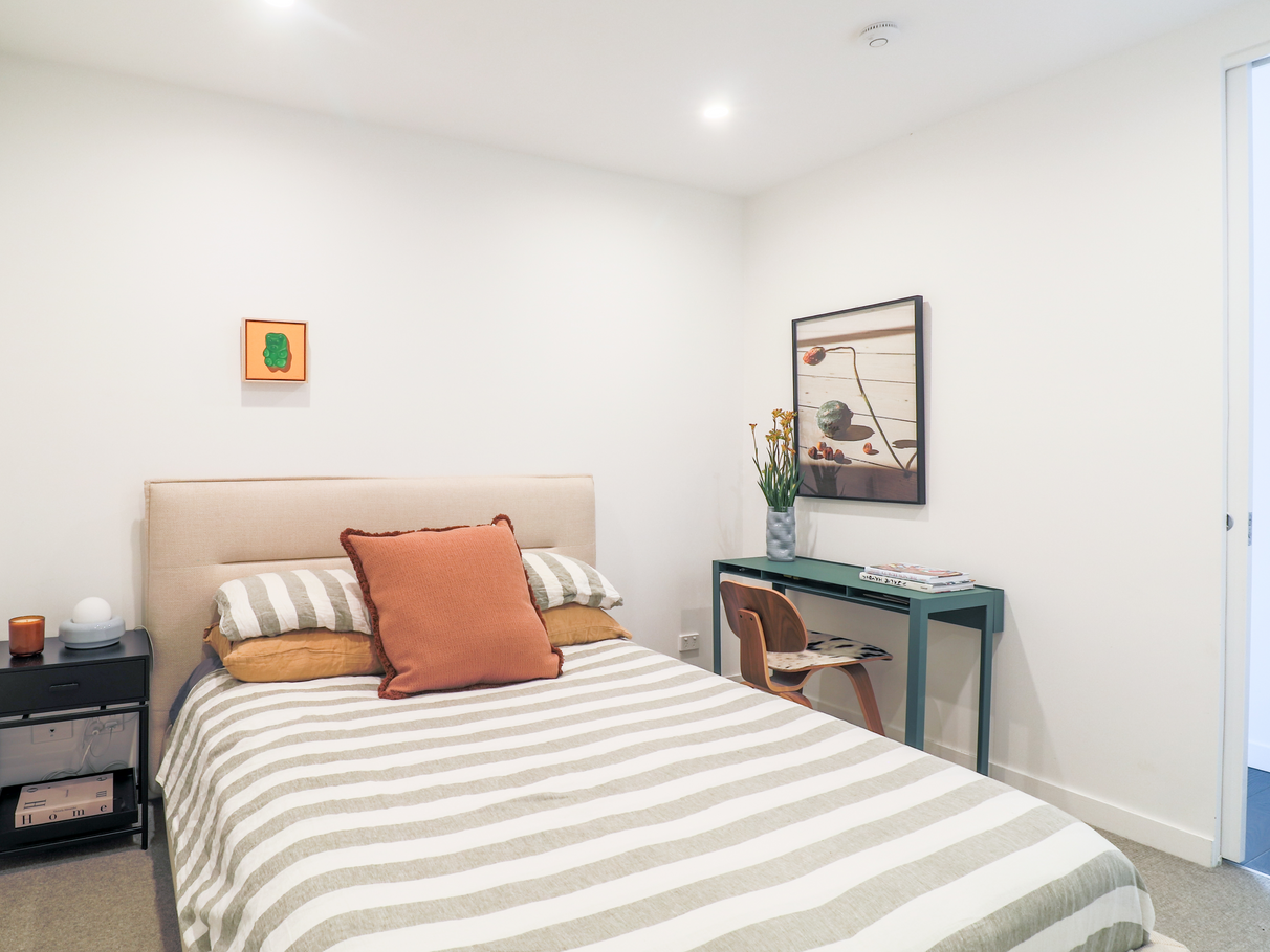The two bedrooms are thoughtfully designed for serenity, each with built-in robes and either a ceiling fan or air conditioning. The bathroom features full-height tiling, modern fixtures, and concealed laundry — everything effortlessly integrated to maximise comfort and space.