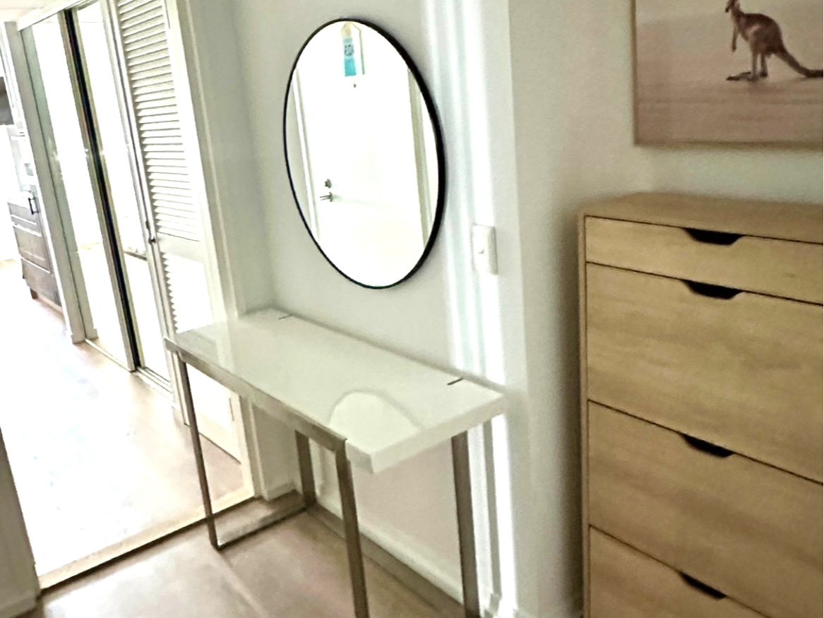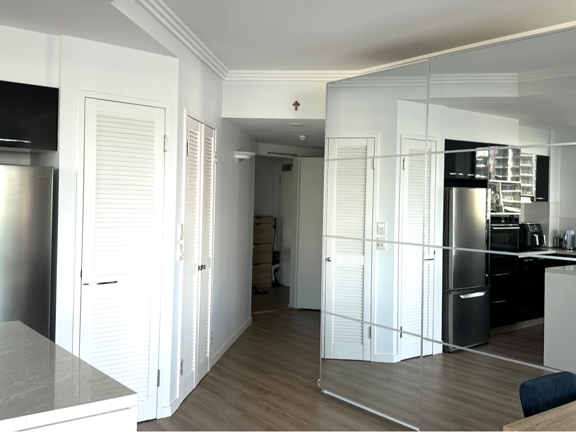 Two separate bathrooms are spacious and make the apartment comfortable. Extra storage space in two large mirrored wardrobes.