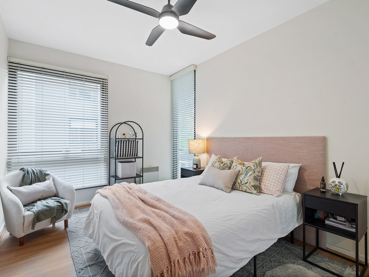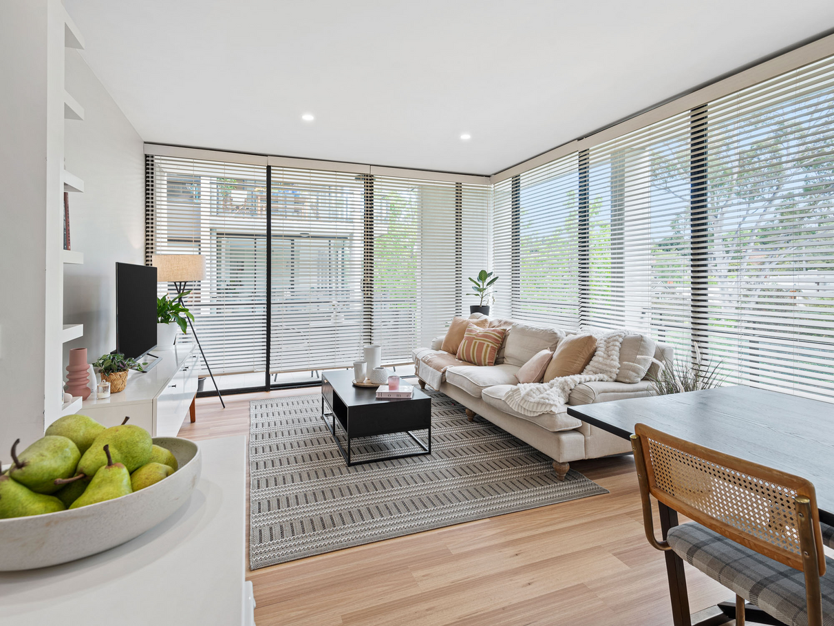Offering a traditional style entry hall with ample storage, 2 generous bedrooms with ceiling fans and one with its own over-sized ensuite. The second updated bathroom features a bath and EURO laundry. The light filled open living/kitchen/dining is wrapped in floor to ceiling windows that overlook the wrap around balcony and tree tops beyond, a perfect vantage point to sit and enjoy the afternoon sunshine. Featuring a high powered cooling and heating system you will enjoy the perfect temperature all year round.