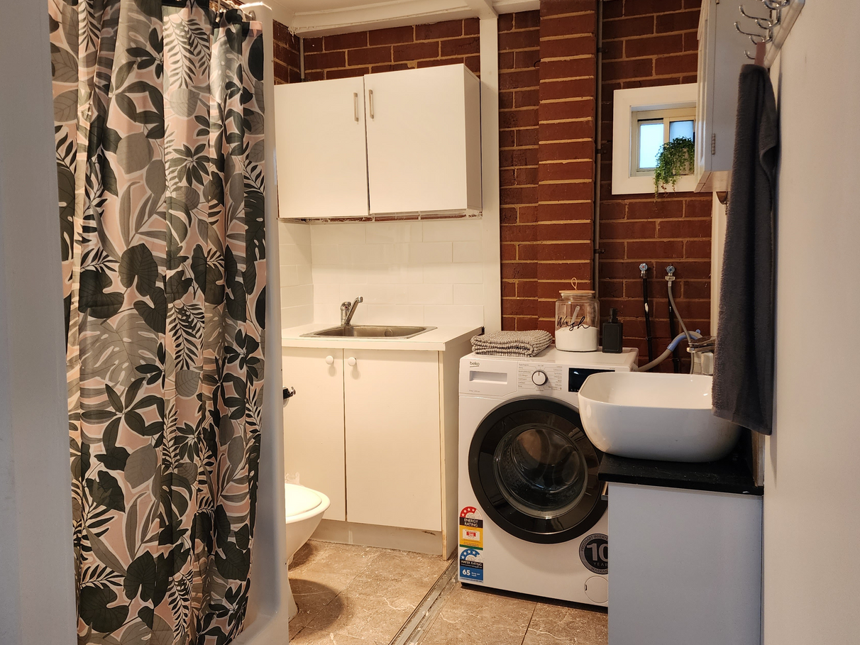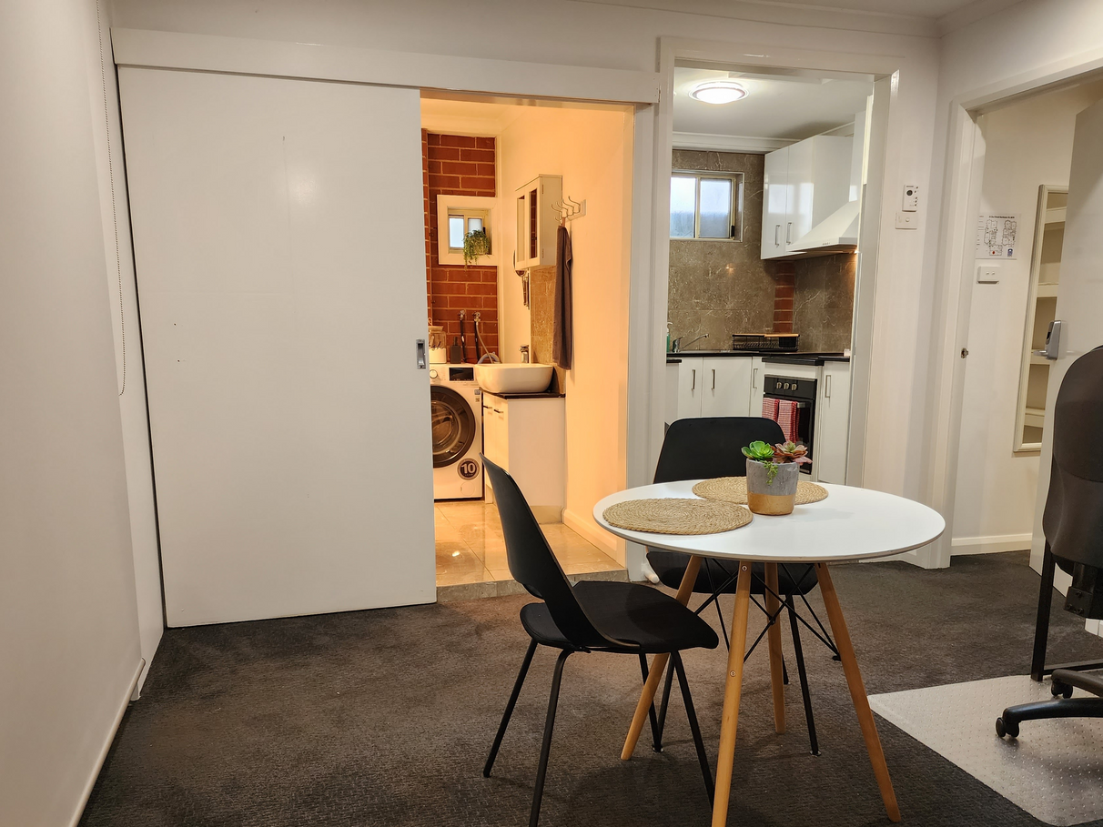 There's a completely separate bathroom adjacent to the dining area, featuring a spacious shower, toilet, hand basin, storage cupboards, and a private washing machine.