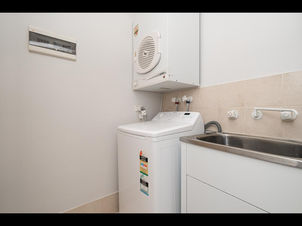 The open-plan living and dining area is carpeted for comfort and plays host to a split-system air-conditioning unit for climate control. A tiled kitchen overlooks it all and is incorporated into the airy design, along with its double sinks, electric cooking appliances and access into a separate laundry.