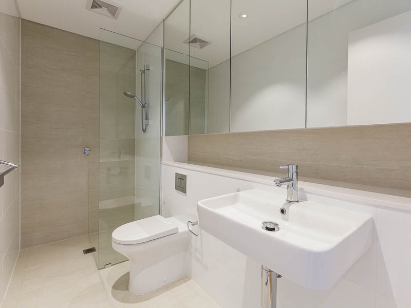 - Neutral bathroom with mirrored storage
