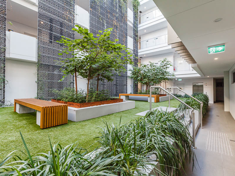 - Open-air vertical gardens with seating in common area