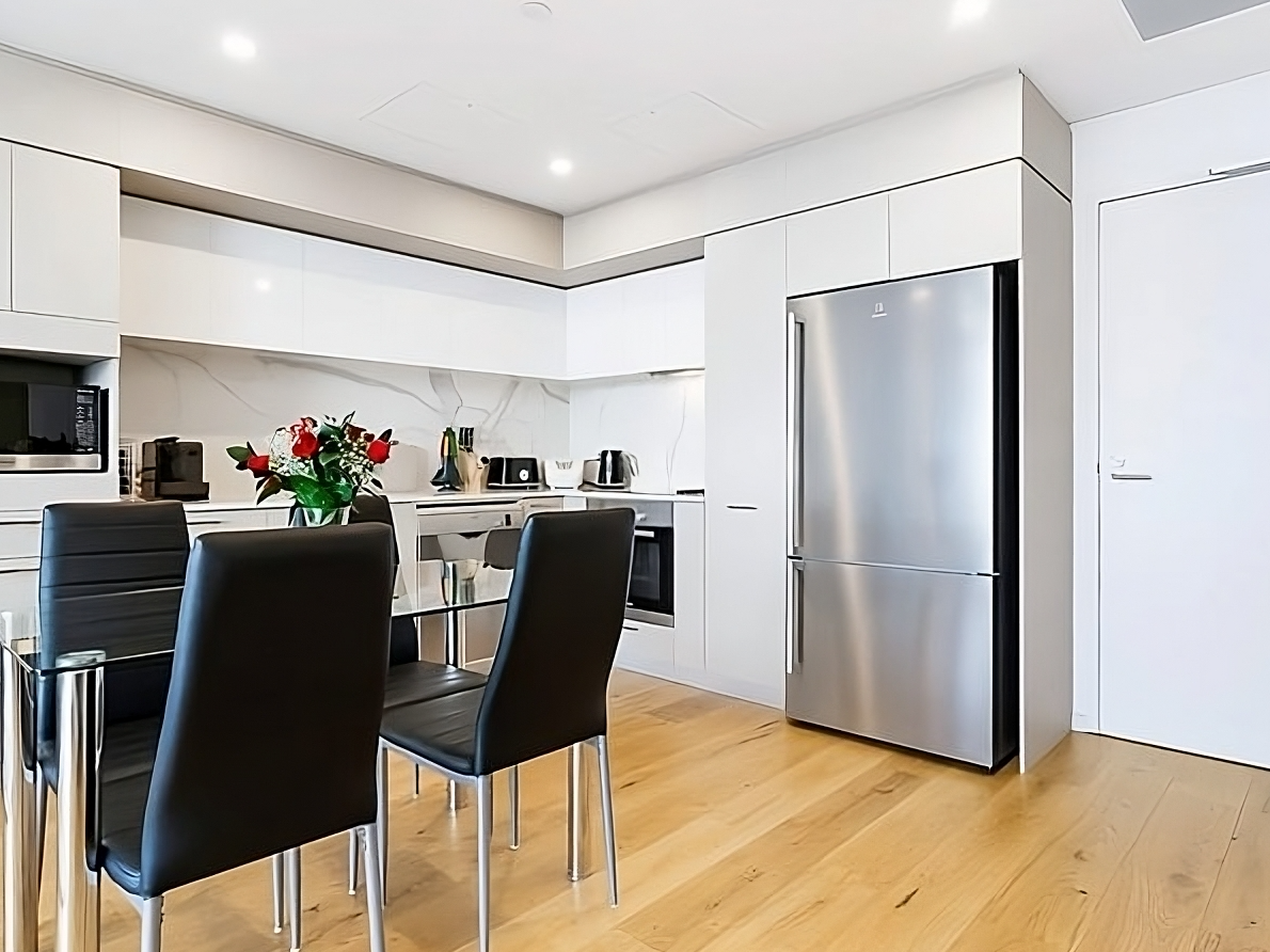 - Open plan kitchen, dining and living, with timber flooring and balcony access