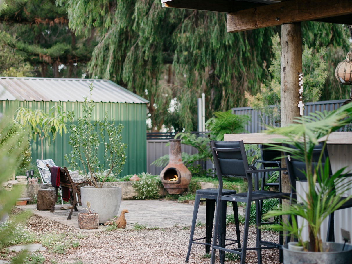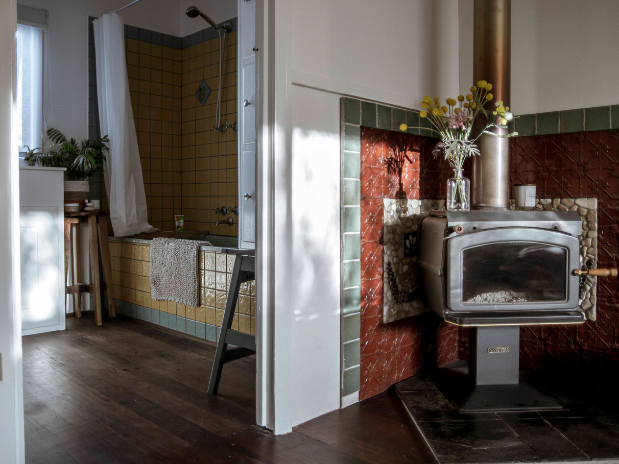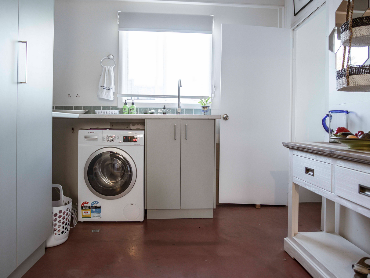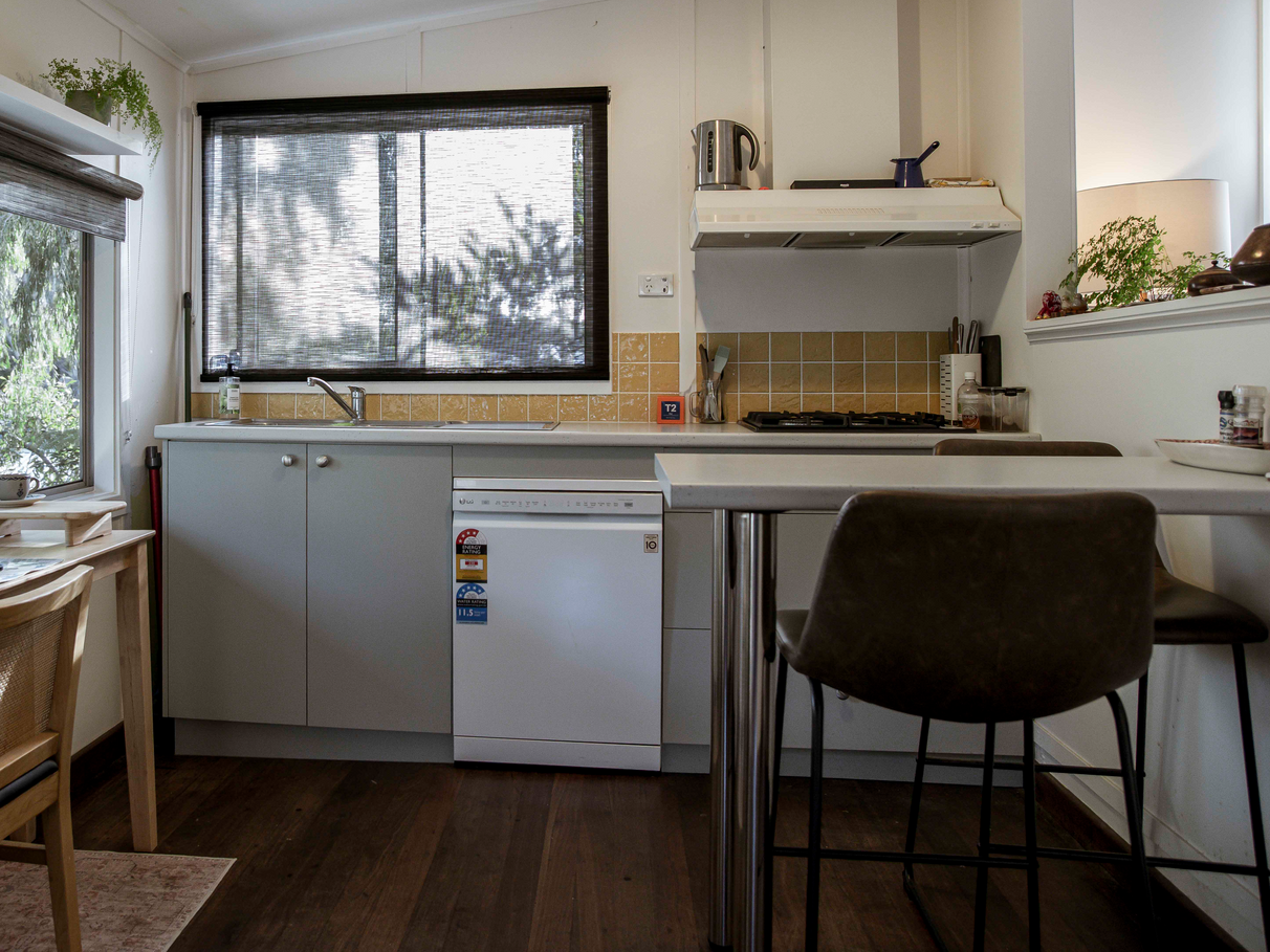 Unit B features a renovated kitchen, built in storage, along with wood heater, bath and outdoor shower set amongst tree ferns.