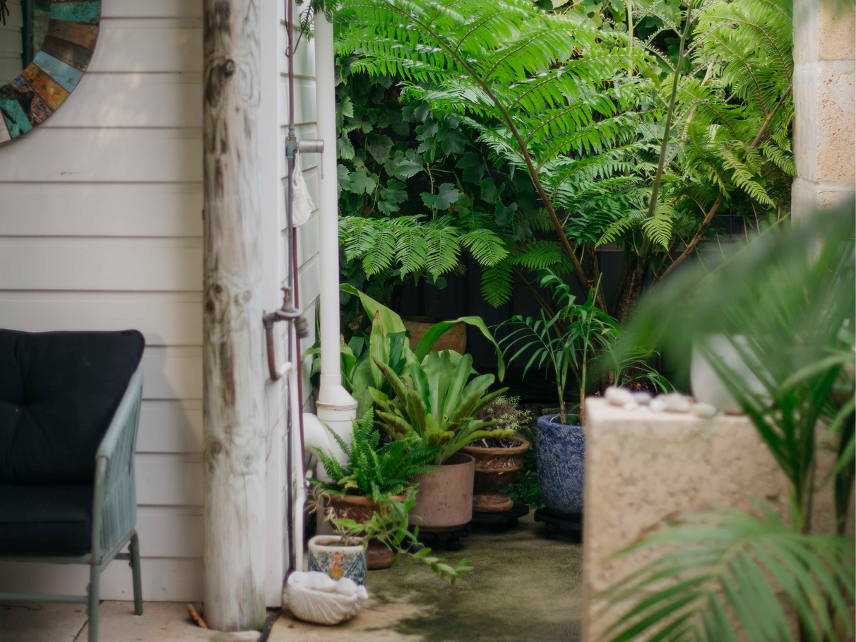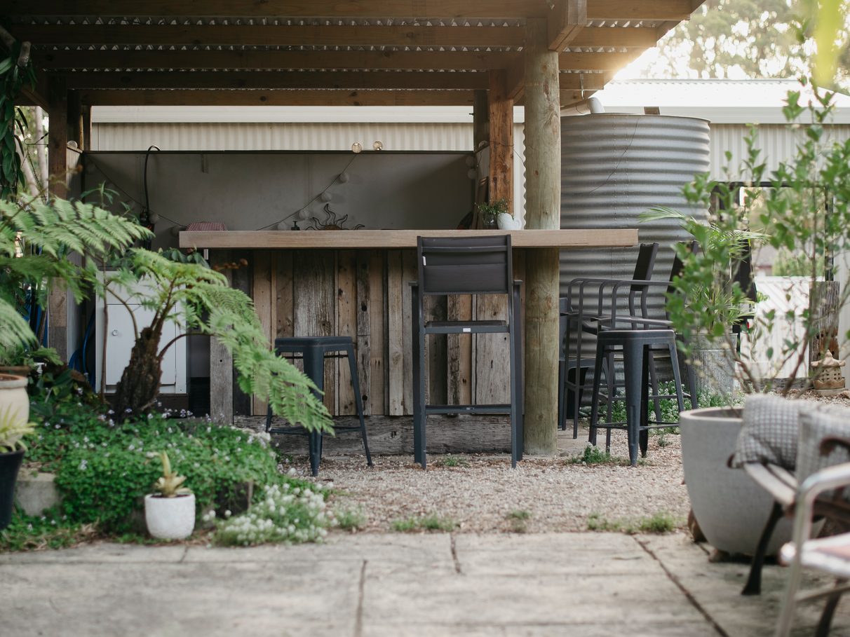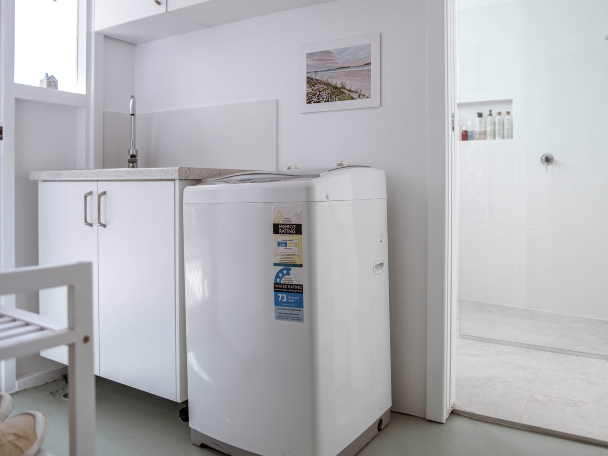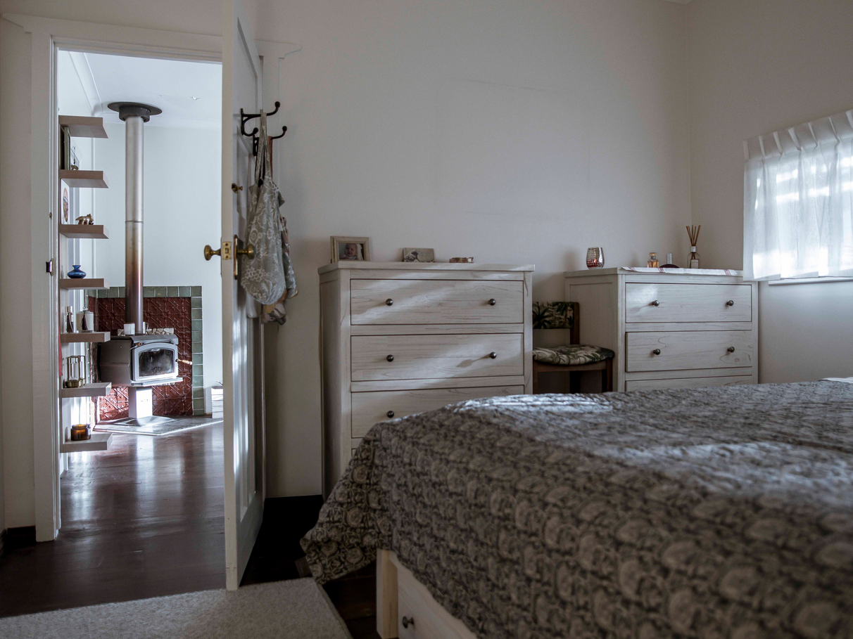 Unit B features a renovated kitchen, built in storage, along with wood heater, bath and outdoor shower set amongst tree ferns.