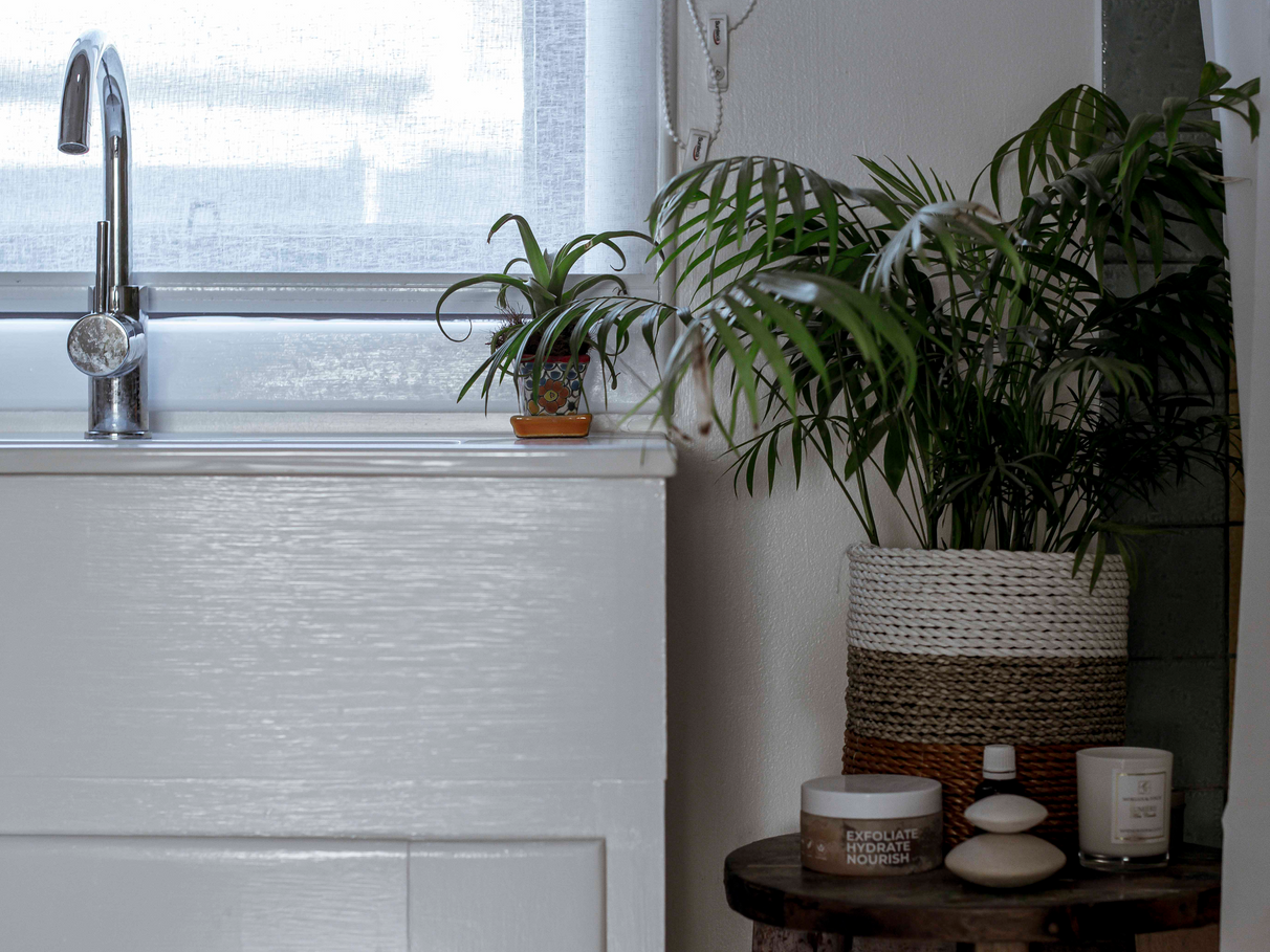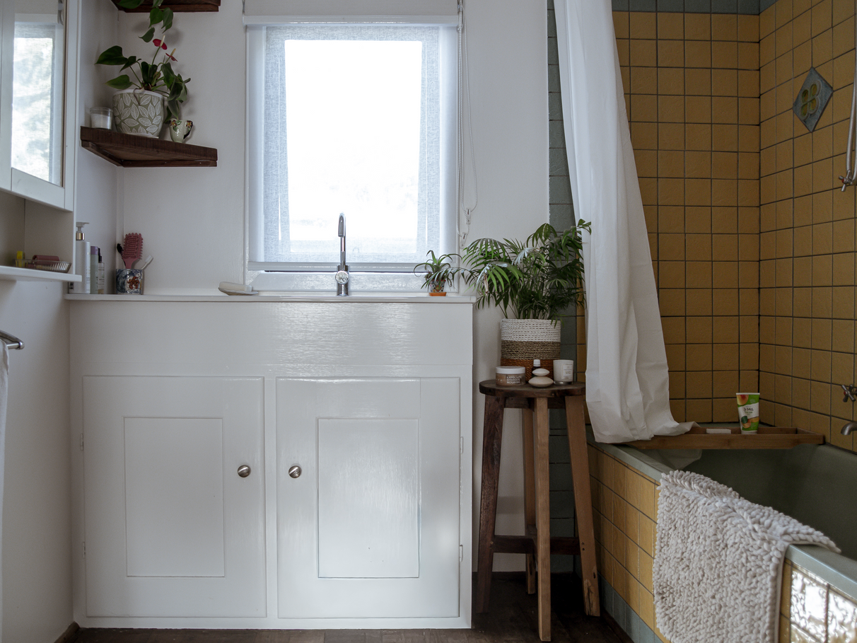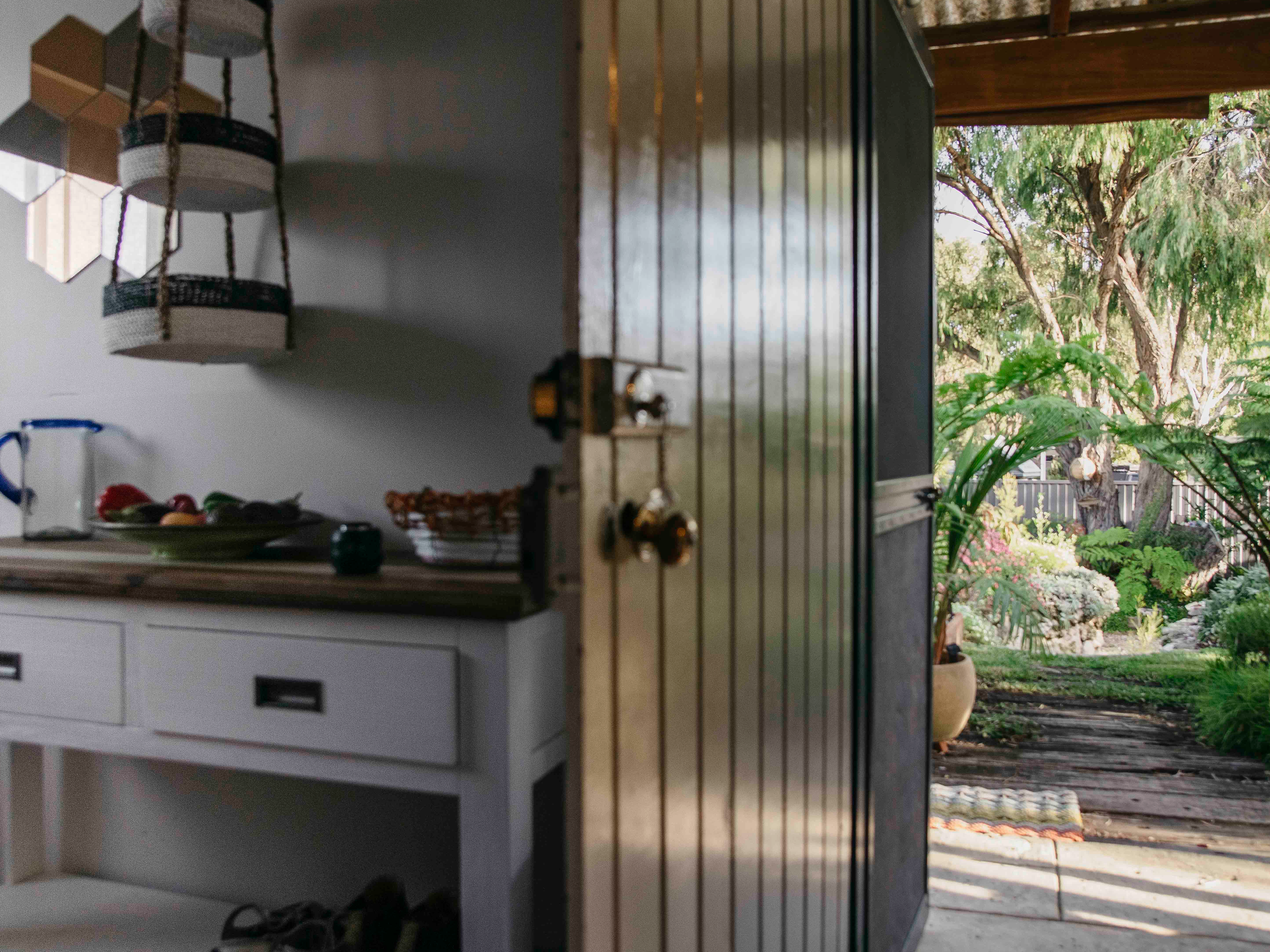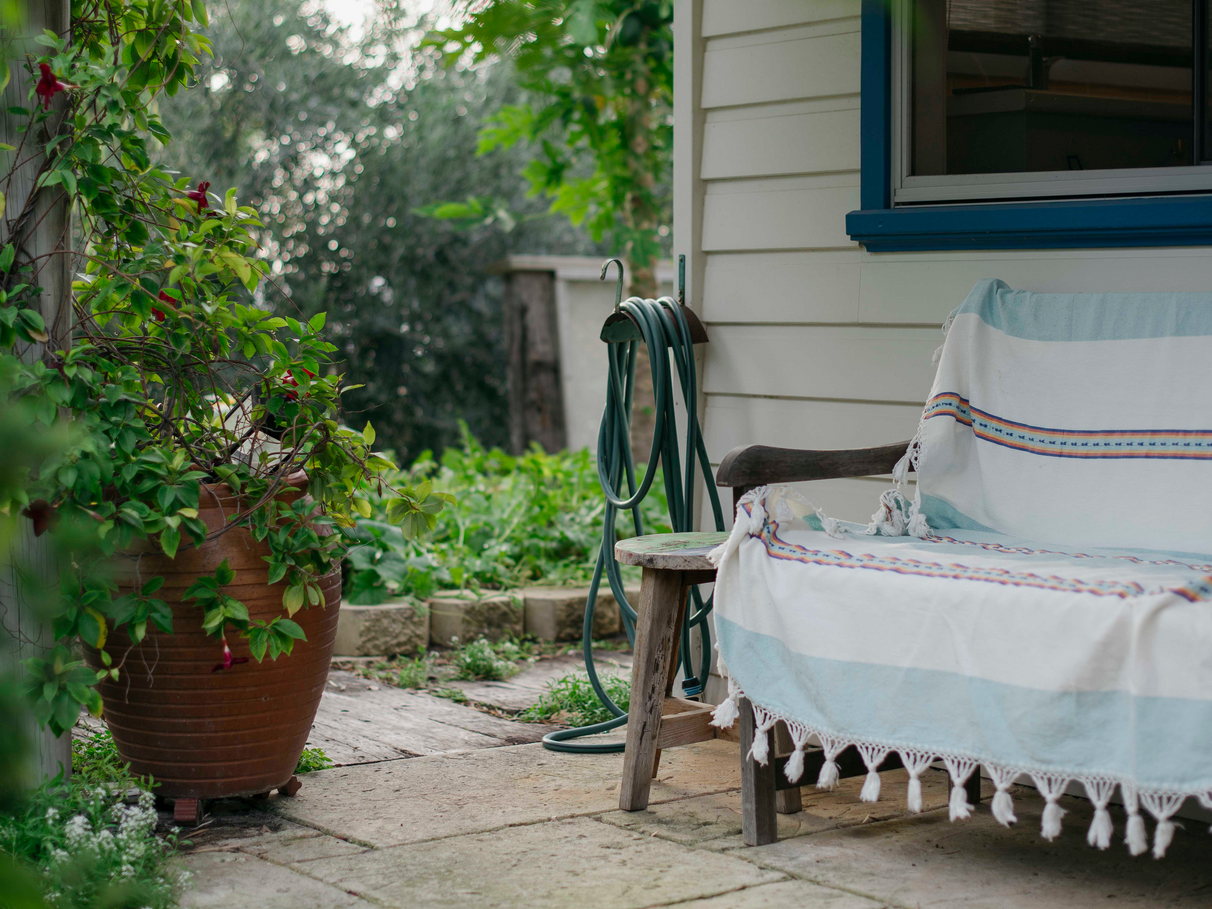 Unit B features a renovated kitchen, built in storage, along with wood heater, bath and outdoor shower set amongst tree ferns.