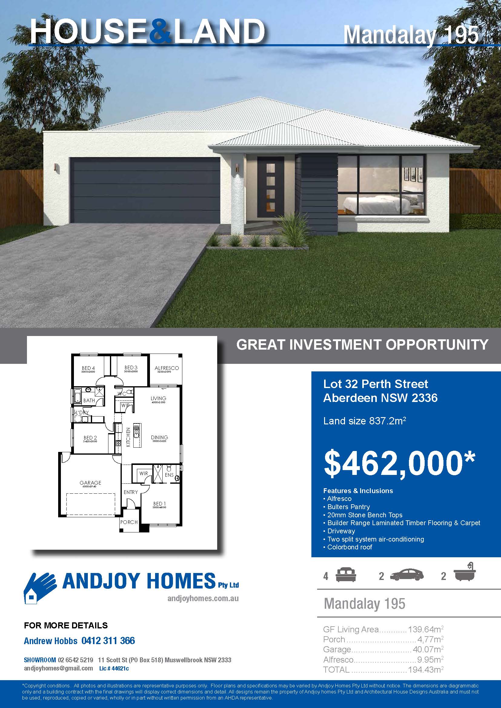 *Images may include upgrade items, fixtures, & features not supplied by Andjoy Homes such as landscaping, paths & fencing. Accordingly, the price doesn't include these items. Price is based on Andjoy Homes’ specification & standard inclusions. Package price excludes external lighting, telephone service, customer account opening fees, stamp duty on land, legal & conveyancing costs. The floor plan is a representation of a Mandalay 195 façade unless otherwise stated. For detailed pricing &and inclusions talk to Andjoy Homes. Land supplied by a separate client. Andjoy Homes reserves the right to alter the images or package without notice. Tender must be accepted within 14 days of presentation for promotional offer to be valid.