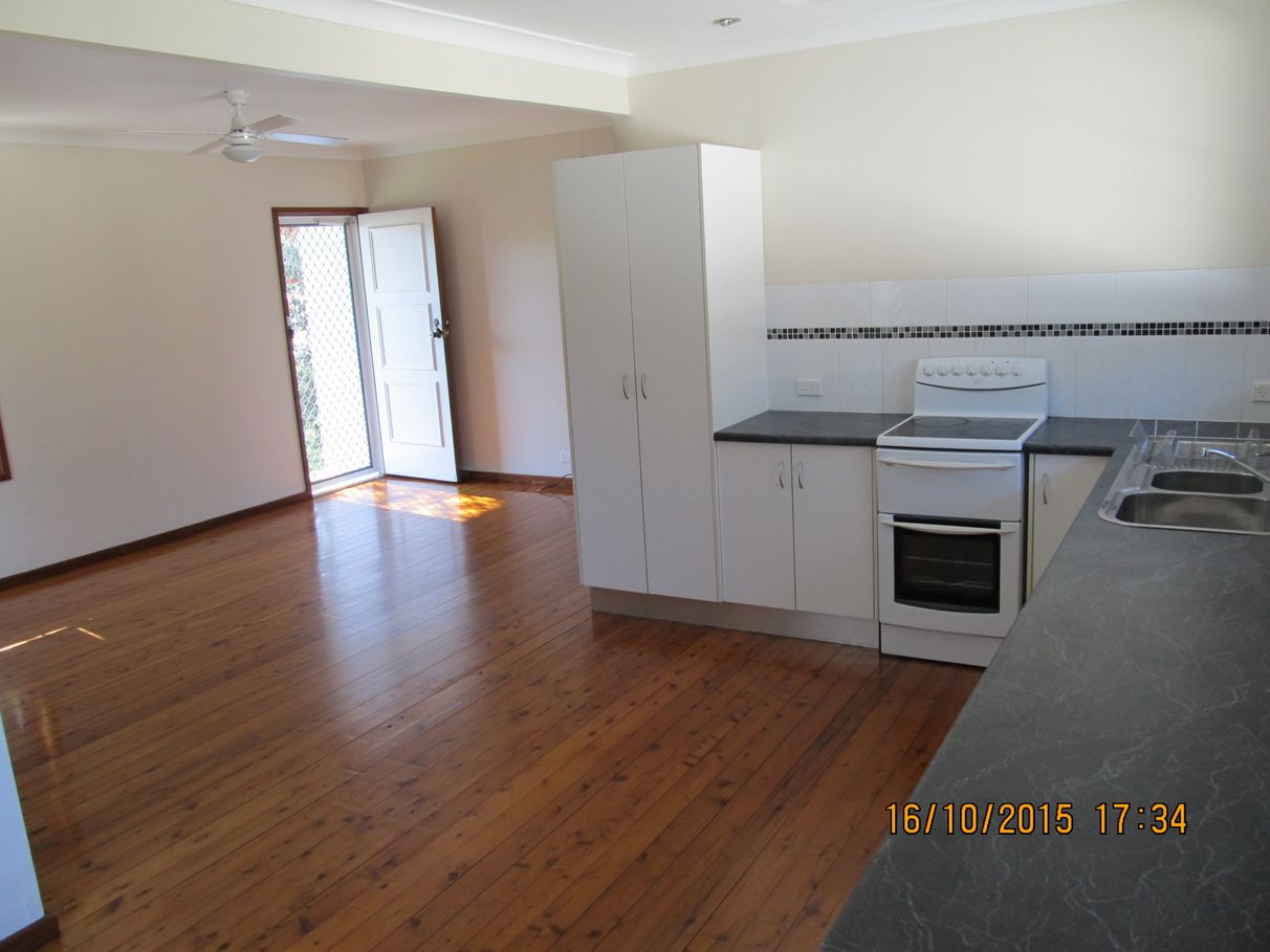 3brm Hardiplank and Tile home on a near level, low maintenance, fully fenced town block, set on a main thoroughfare, with a local park across street as well as 300m to local primary school, and one block from nearest service/convenience station. Home has had all new kitchen, bathroom, laundry and separate toilet areas 'fully' refurbished, including all tiled areas, bathroom tiling now being floor to ceiling, 5yrs ago, along with the repolishing of all flooring. Inside the open plan kitchen/dining/lounge area, you'll find a more than adequate split system air con, that is assisted by a ceiling fan in the lounge. Two of the three bdrms also have fans. The exterior was repainted 3yrs ago, and interior redone in the last 2 weeks. Outside the back door is a level neatly covered concrete bbq area that meets the end of the carport at the 4x4m tool/garden shed at one end, and the grass at the other. The 260ltr hot water unit is just two yrs old. A more than ample linen cupboard is in the hall, and two 12mnth old photoelectric smoke alarms are also fitted,