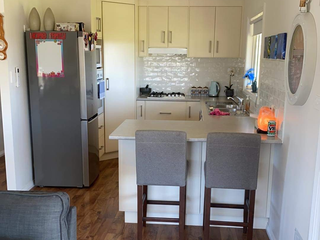 Kitchen has electric wall oven with gas hotplates, large pantry plus seating at a 2 seater breakfast bar attached to the kitchen.