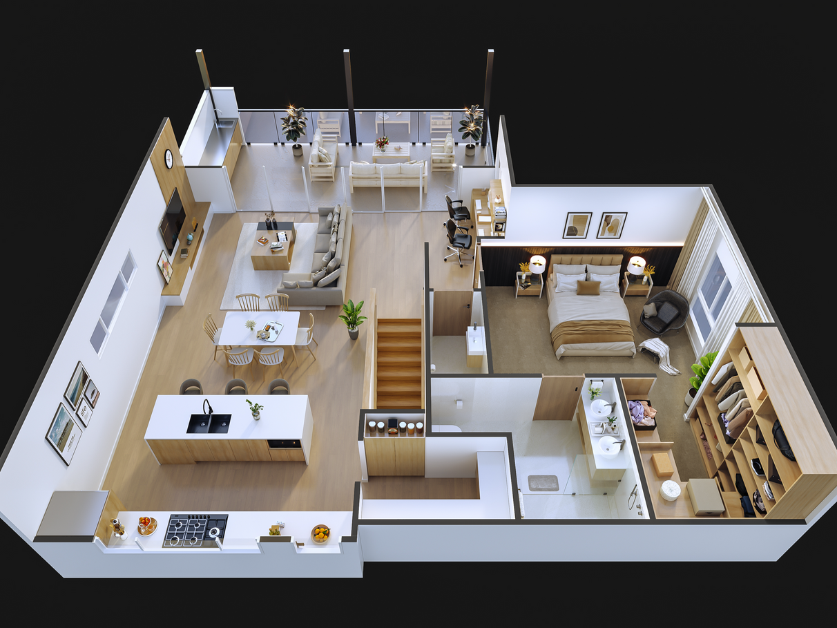 Designed with the views in mind, the reverse living layout maximizes panoramic vistas of the Bay. The upstairs kitchen flows seamlessly into the living area, where floor-to-ceiling glass doors open to breathtaking views over the marina—perfect for unwinding or entertaining guests.