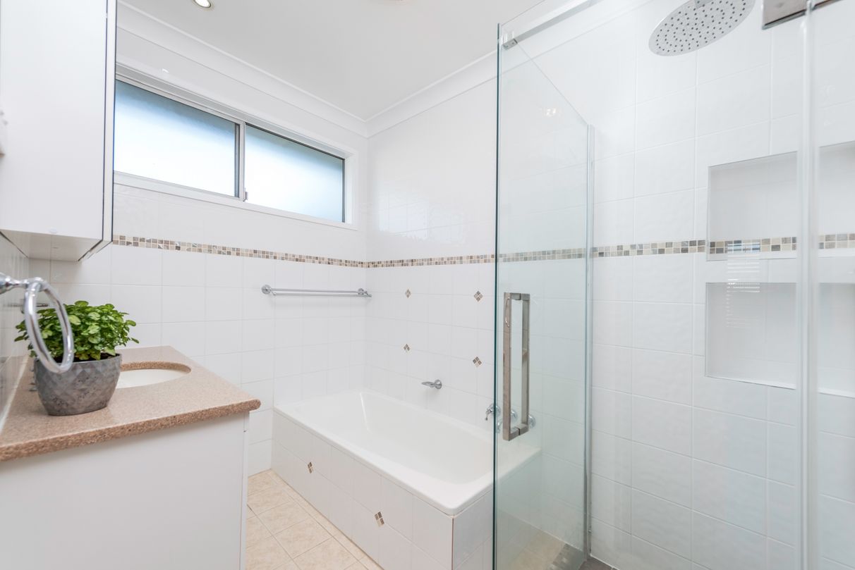 Three generous bedrooms with large mirrored robes and ceiling fans, and stylish, fully-tiled family bathroom with bath, shower with two wall niches and rainfall shower head, separate toilet and updated internal laundry.