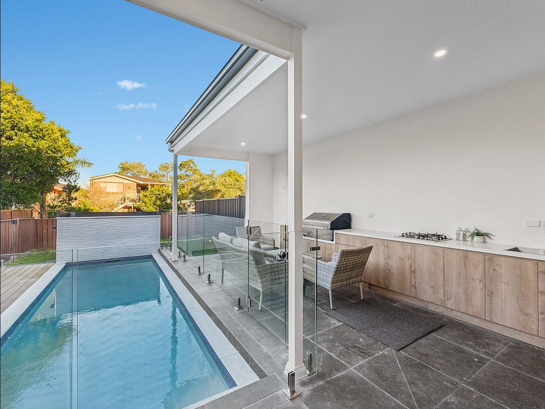 - Overlooking sun drenched swimming pool and level backyard