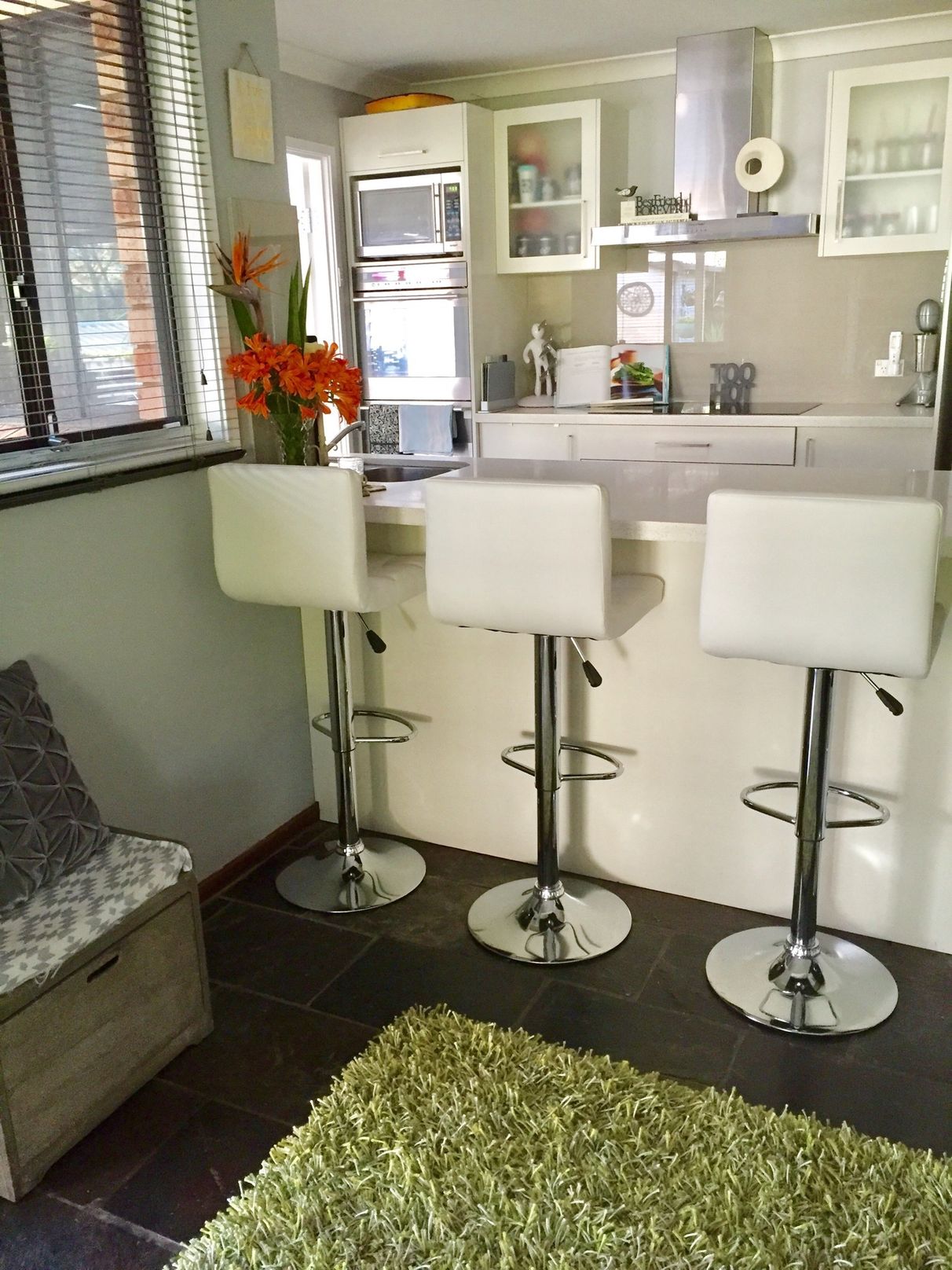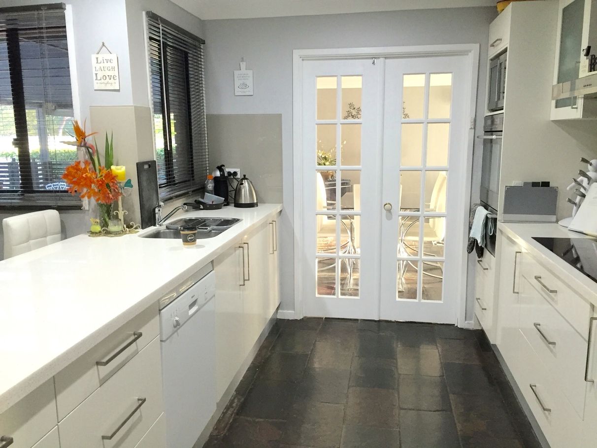 Newly renovated kitchen with stone bench top overlooking the large outdoor covered entertaining area and mature landscaped yard.