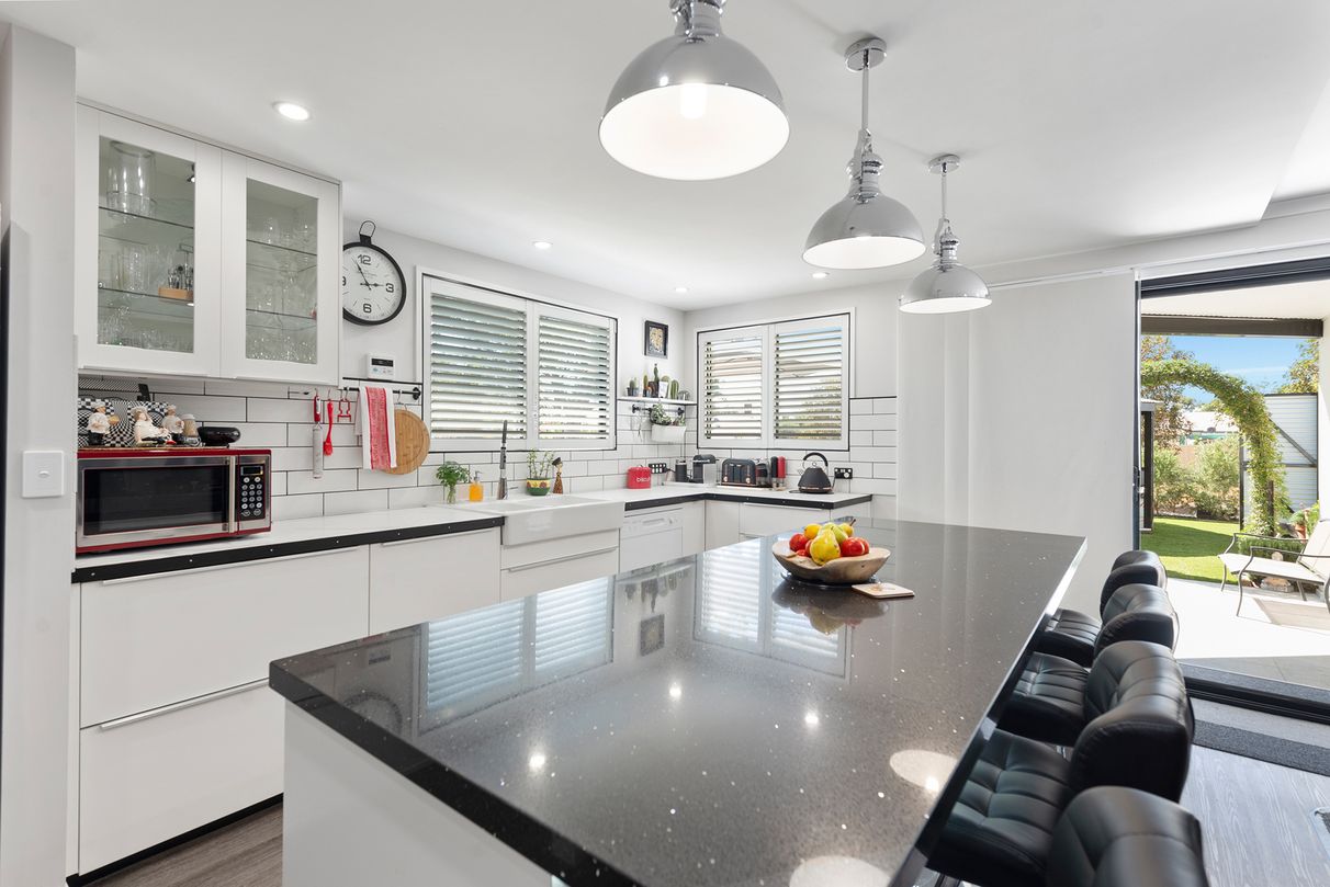 Large open plan kitchen dinning and lounge area with ceiling fan fitted in recessed ceiling