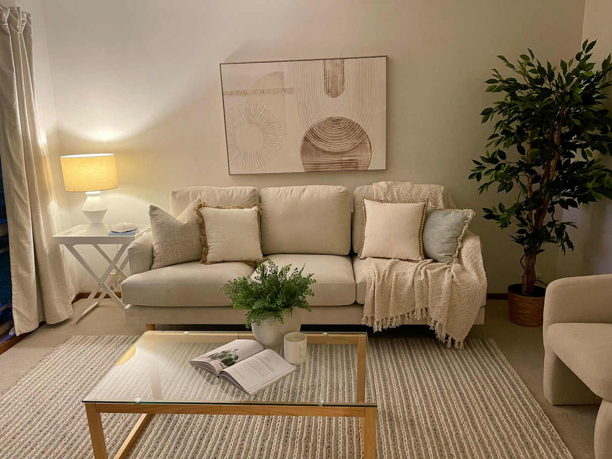 * Sunlit living room welcomes you with large windows framing the leafy garden outlook
