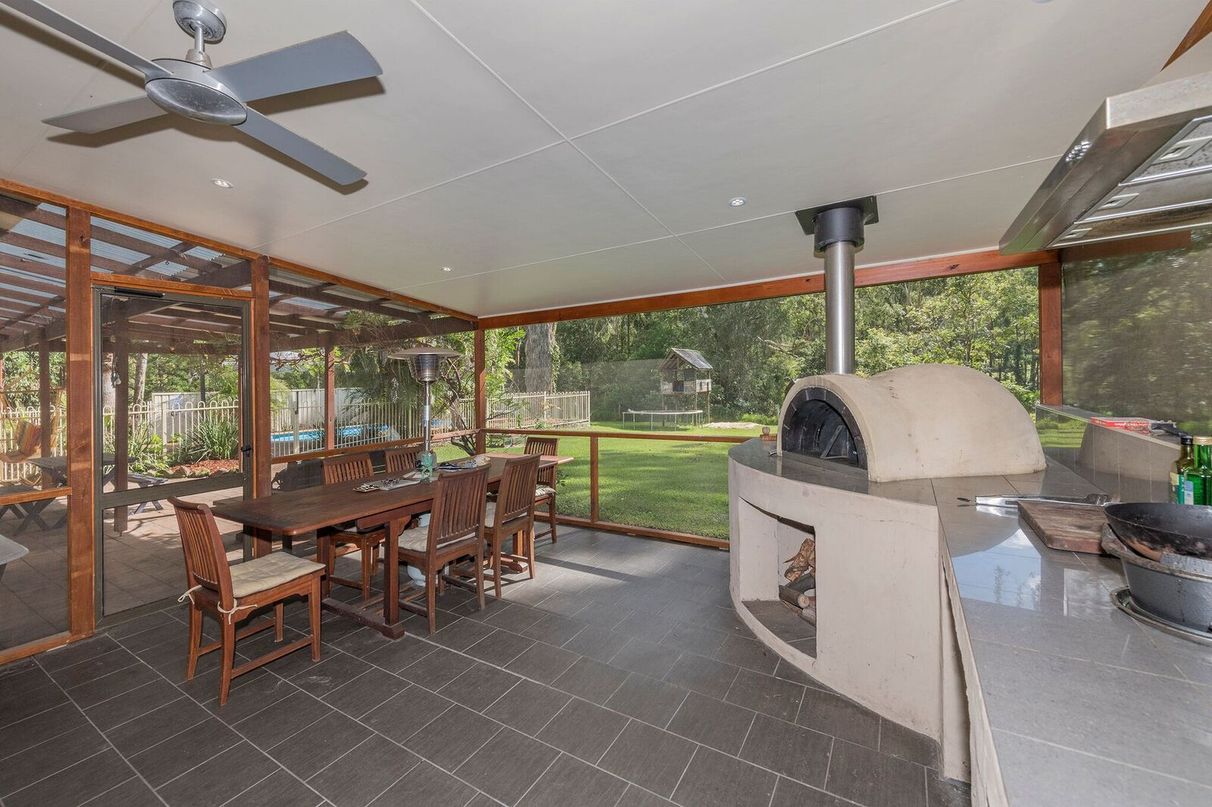 A spacious outside screened room with kitchen facilities and a wood fired oven which is ideal for the family and when relatives get together.
