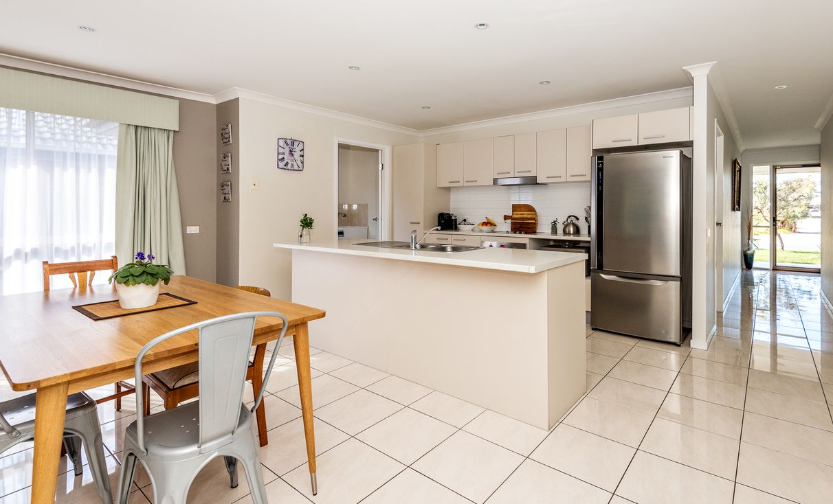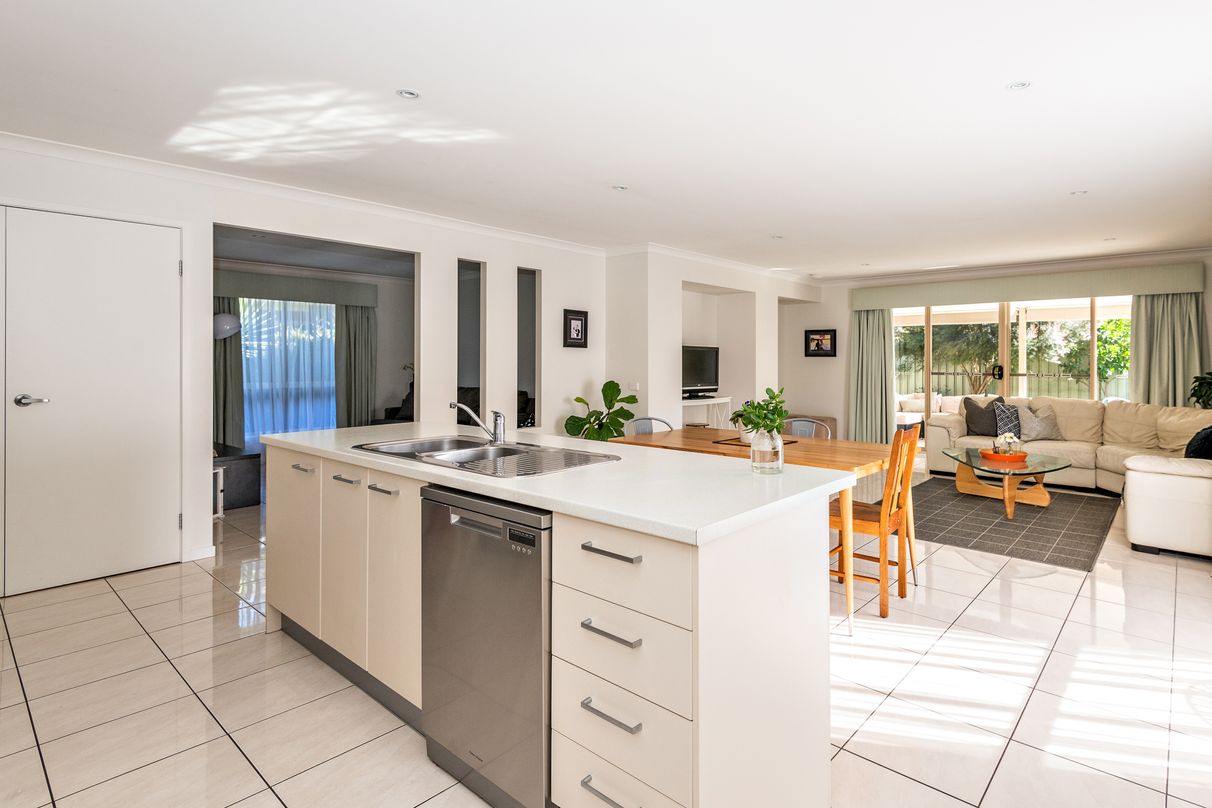 A spacious island bench kitchen overlooks the open and flowing living spaces at the centre of home extending to the outdoor living and an established garden and citrus trees.