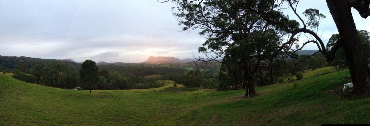 100 acres with elevated,undulating stunning panoramic views of Border Rangers, Wollumban (Mt.Warning), Mt.Burrel and one of the Nimbin Rocks. A good mix of lovely rolling cleared paddocks & forested areas with a dam & creek.
