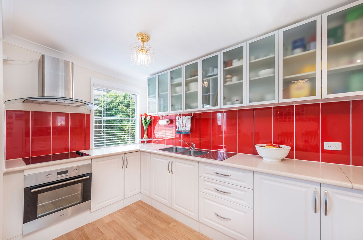 Comfortable lounge and a generous open dining and beautiful modern kitchen with loads of built-in storage, stainless steel electric cooking appliances and a striking red tiled splashback.