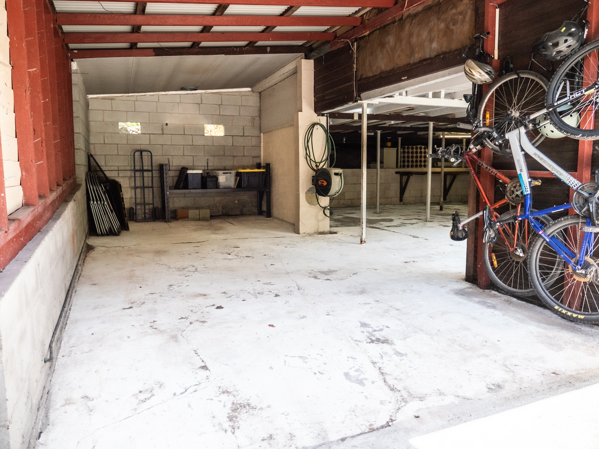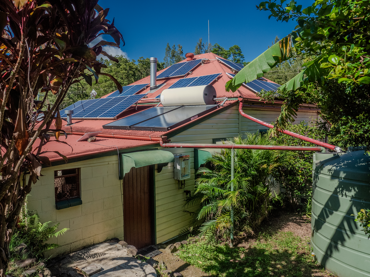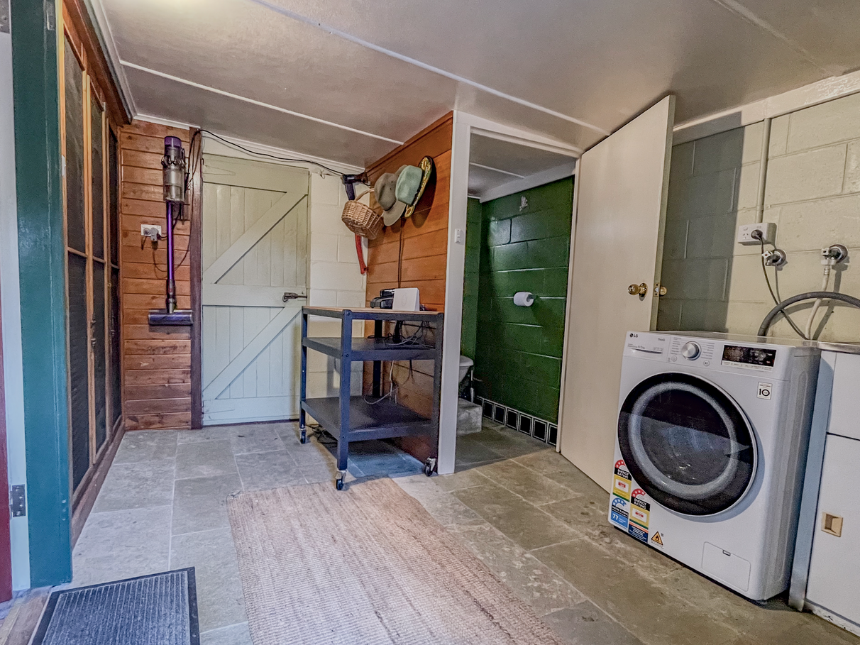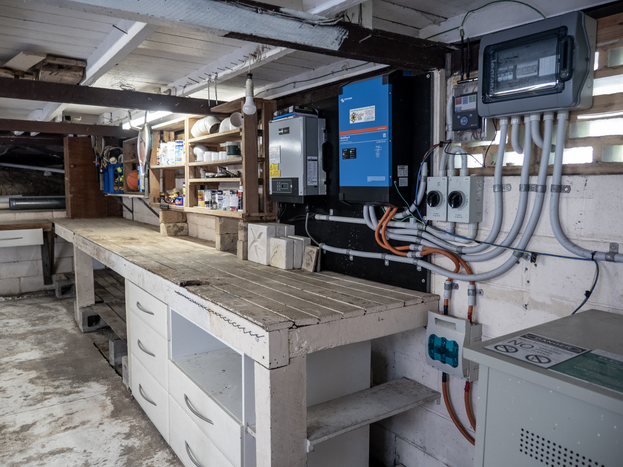 The solar inverters and batteries are stored in the large, spacious workshop/garage below the main living areas. For more tool storage, there’s a garden shed with an attached playroom/studio nestled in the trees.