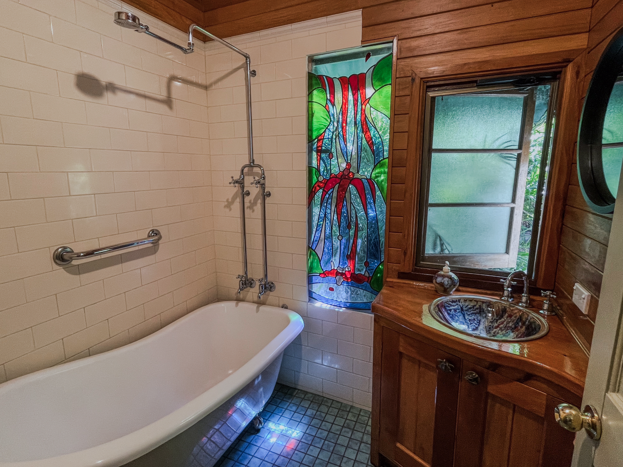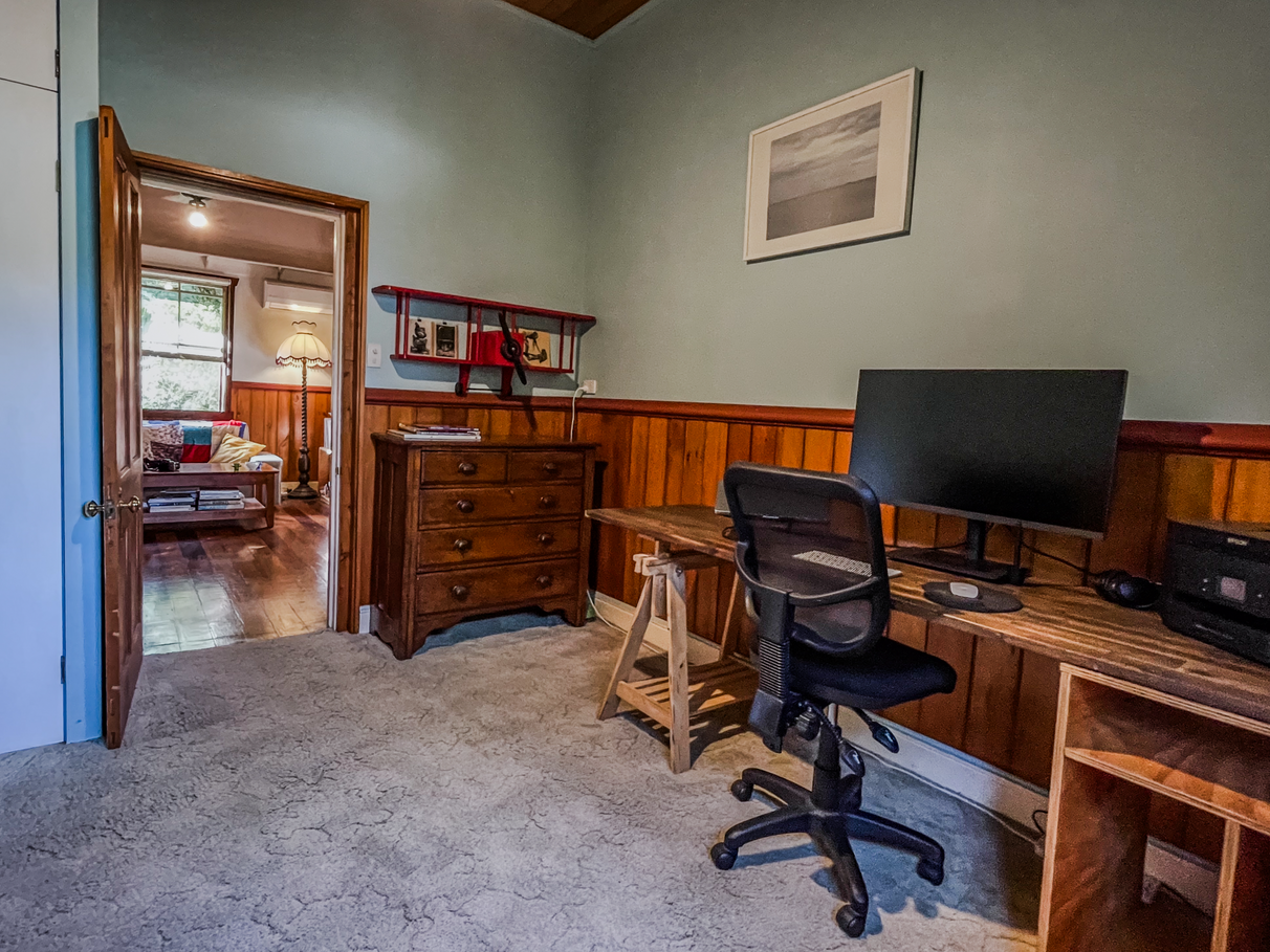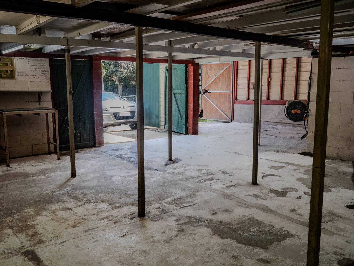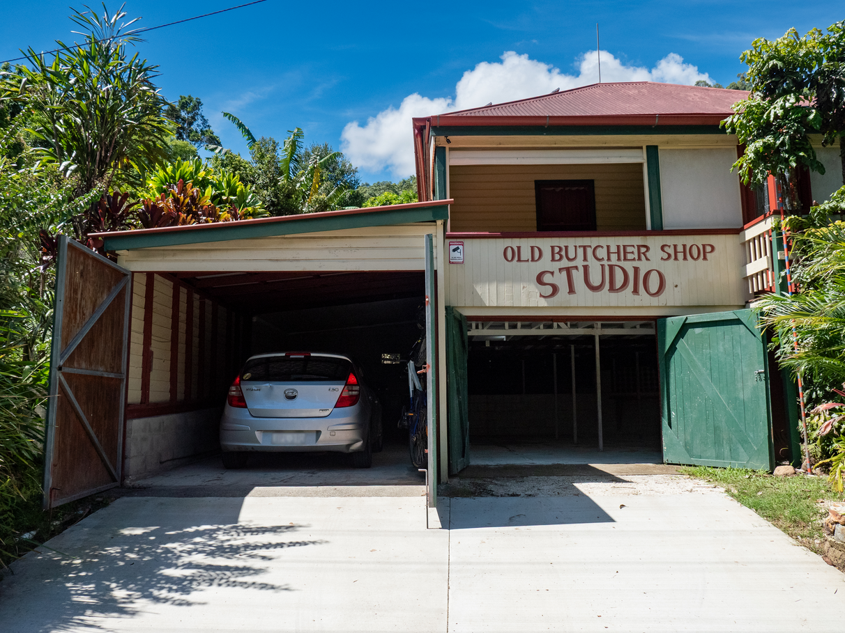 The solar inverters and batteries are stored in the large, spacious workshop/garage below the main living areas. For more tool storage, there’s a garden shed with an attached playroom/studio nestled in the trees.