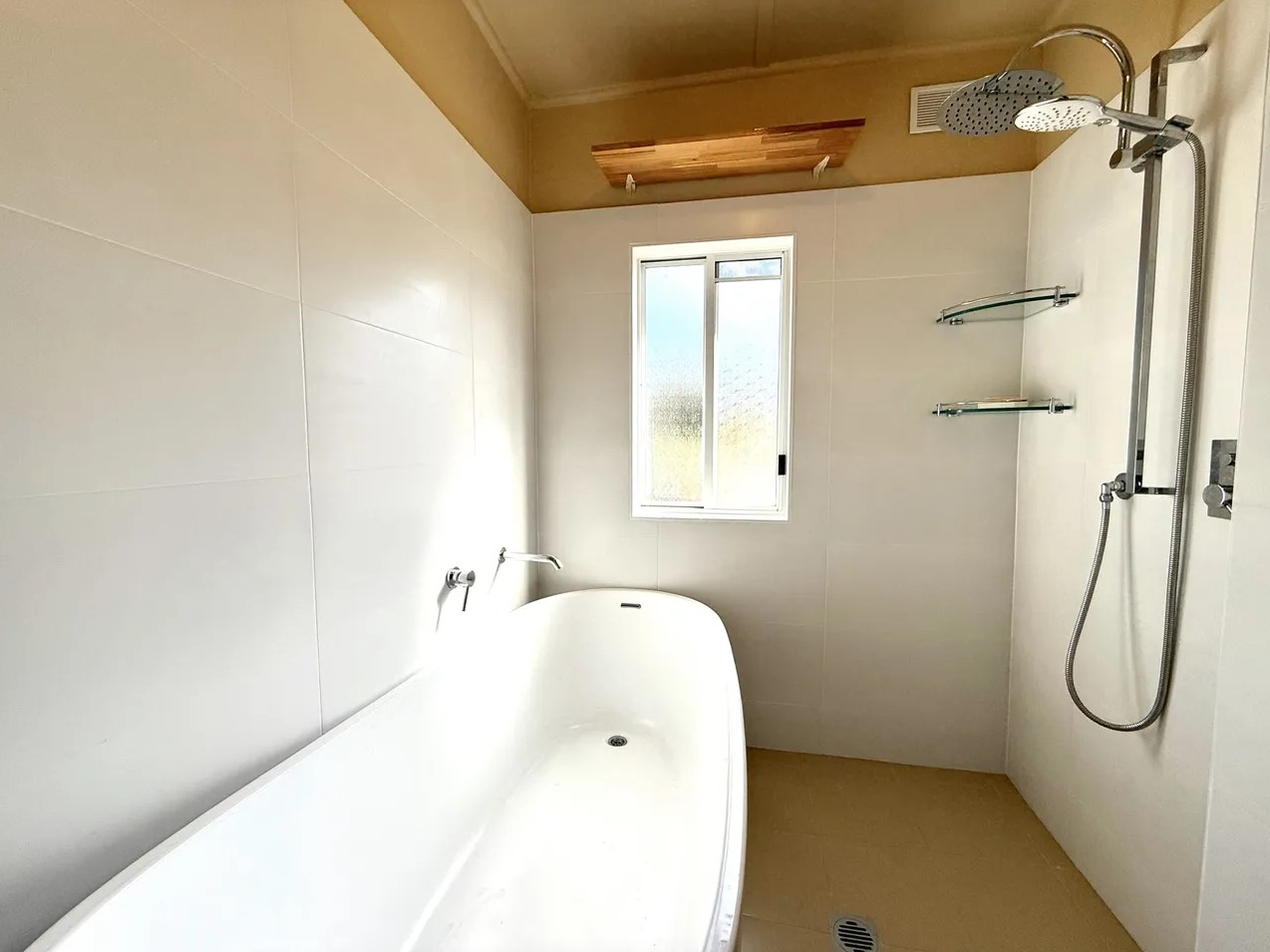- Generous freestanding bathtub