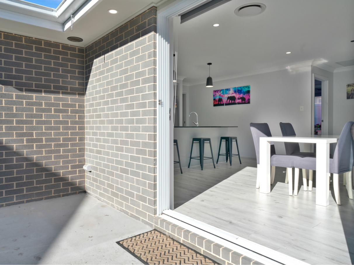 Open plan living / dining area with a 3 door sliding stacker to a sunlight filled oasis patio.