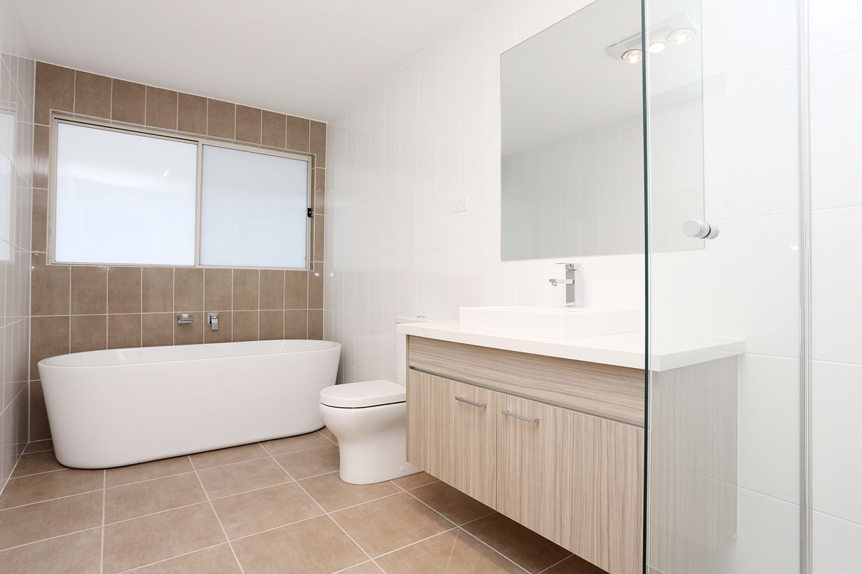• Large fully tiled bathrooms with semi frameless shower screens, internal wall niches, caesarstone floating vanities (double in ensuite), translucent windows plus attractive free-standing bath in the large family bathroom;