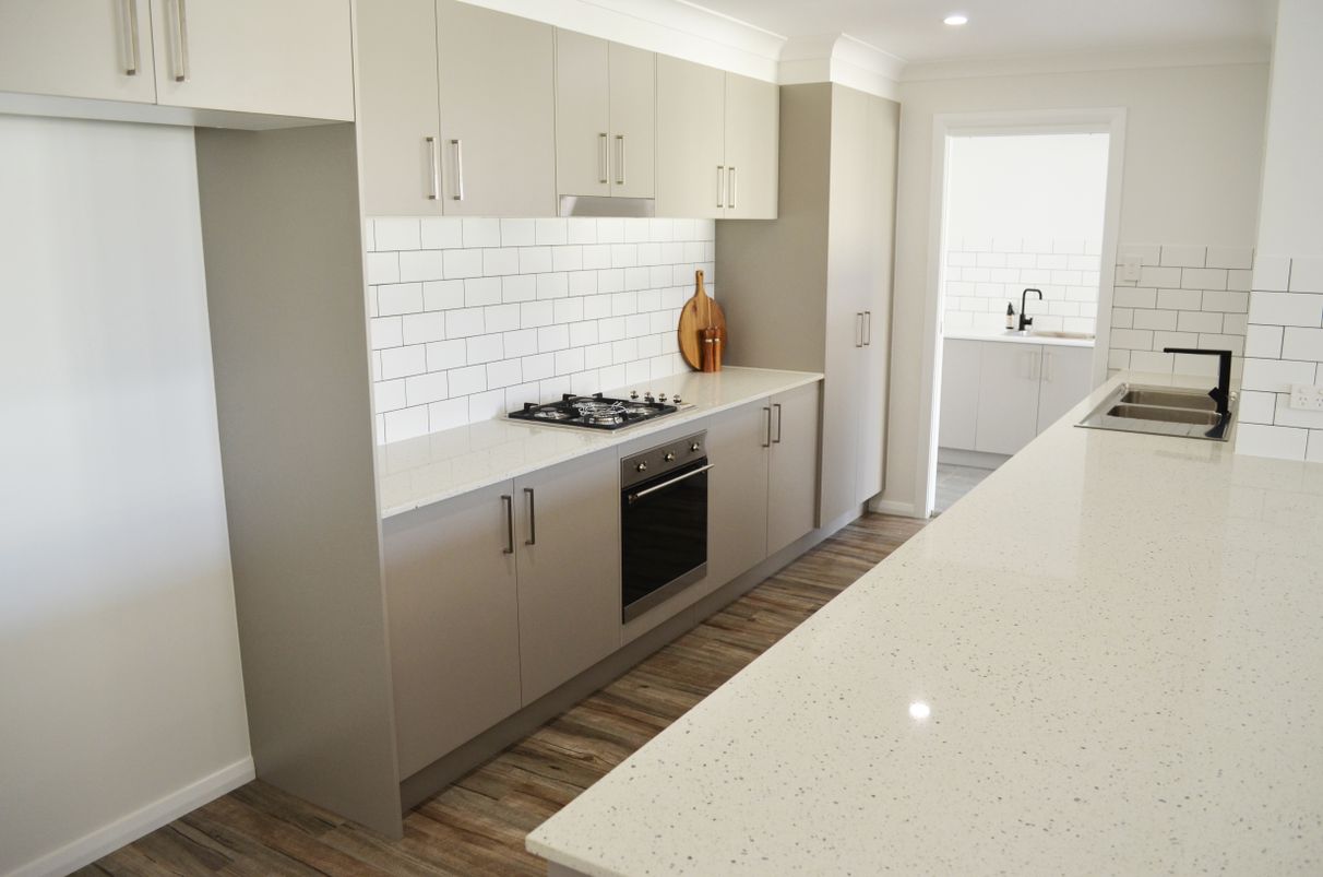 An open plan living area features a galley style kitchen with generous stone benchtop, and plenty of storage. Great for entertaining with plenty of natural light.