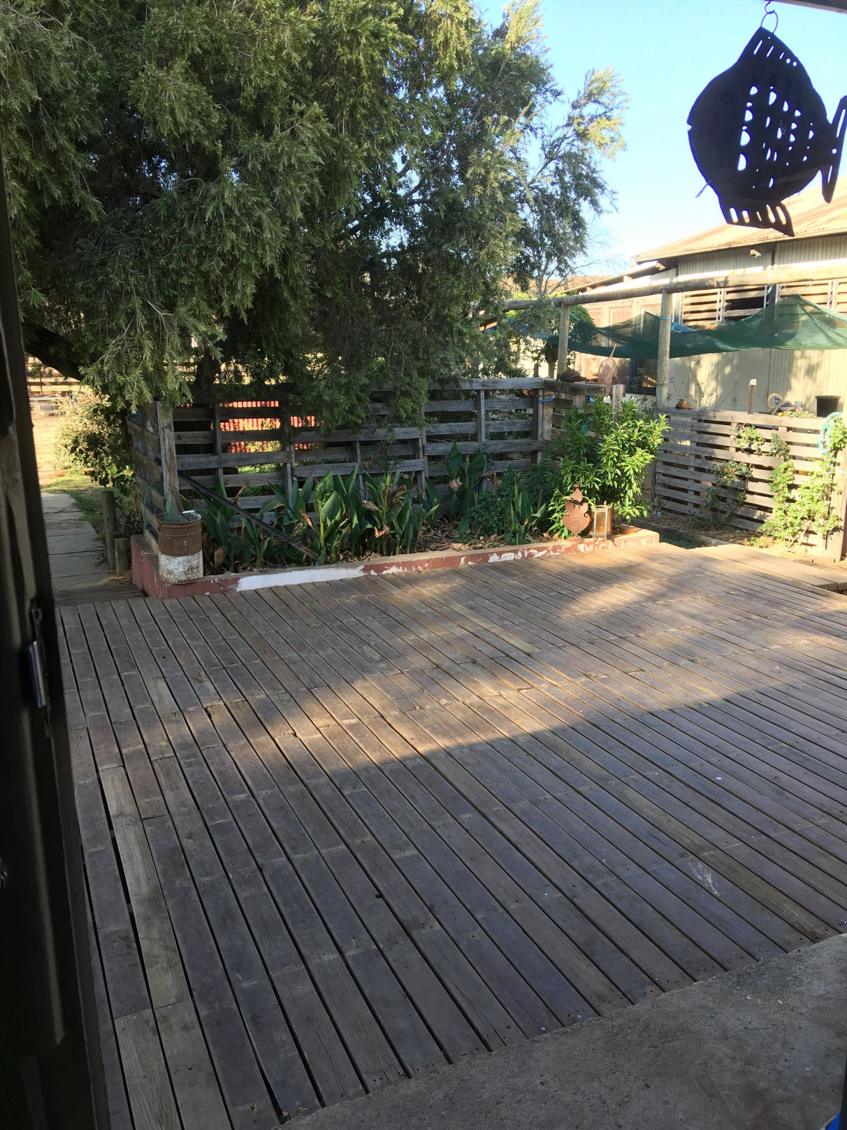 6 x 5 mt deck area leading to a rustic shade/ bbg area with single car garage.