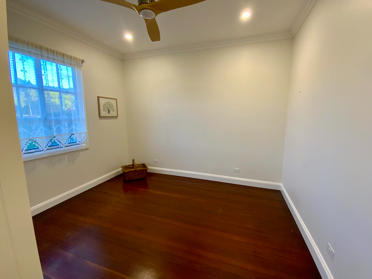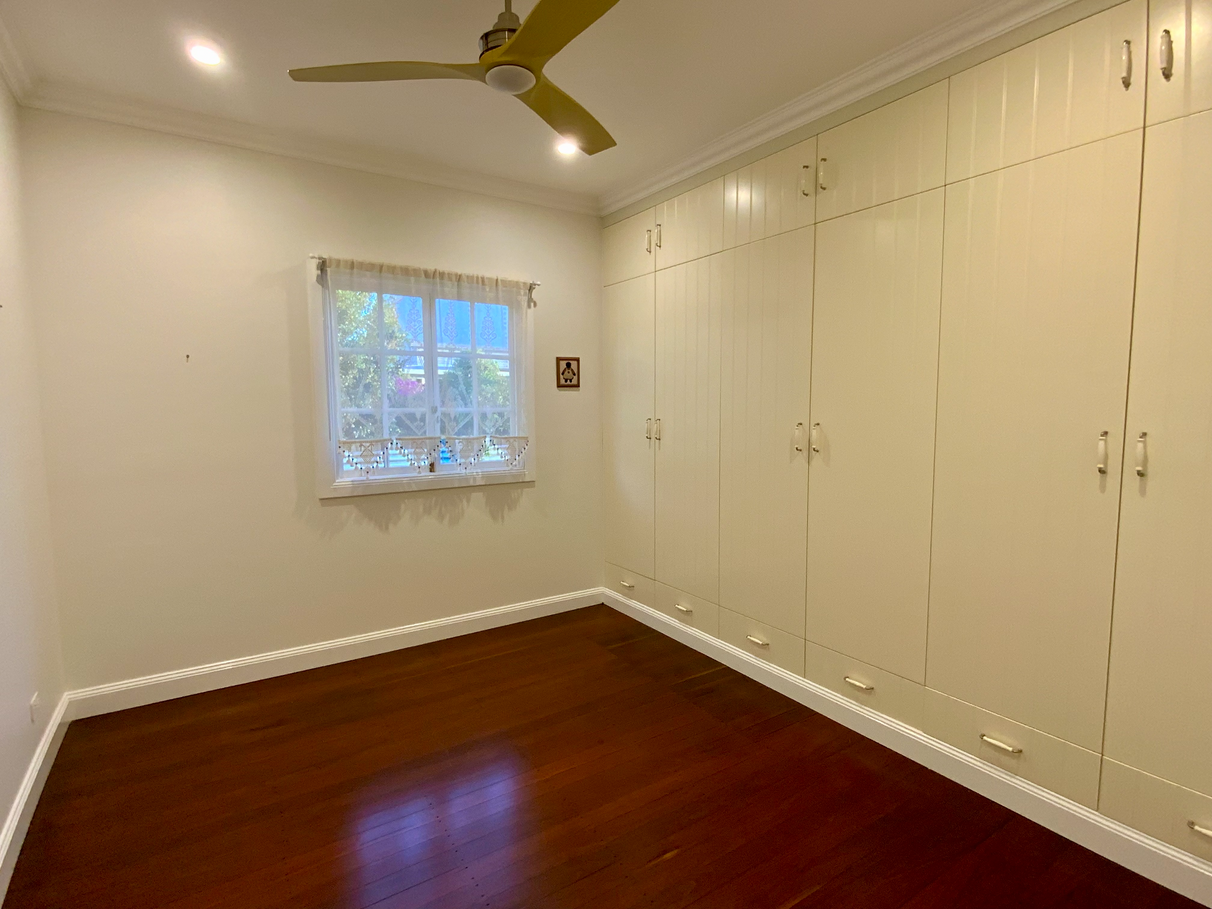 Three bedrooms, two generous size with built-in floor-to-ceiling storage and ceiling fans. The third bedroom is sun-drenched, with separate access from rear garden and deck;