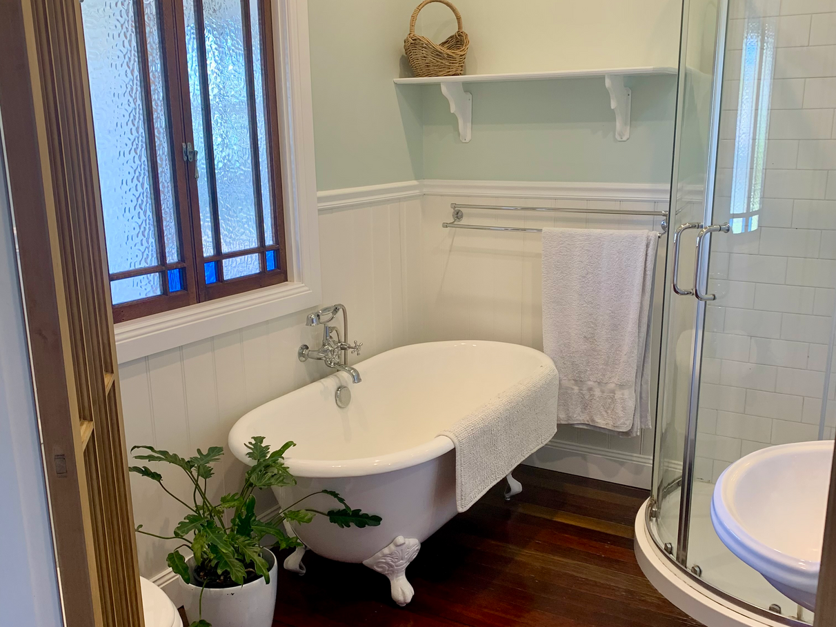 Functional bathroom with toilet, spacious shower and cast-iron ball and claw bathtub;