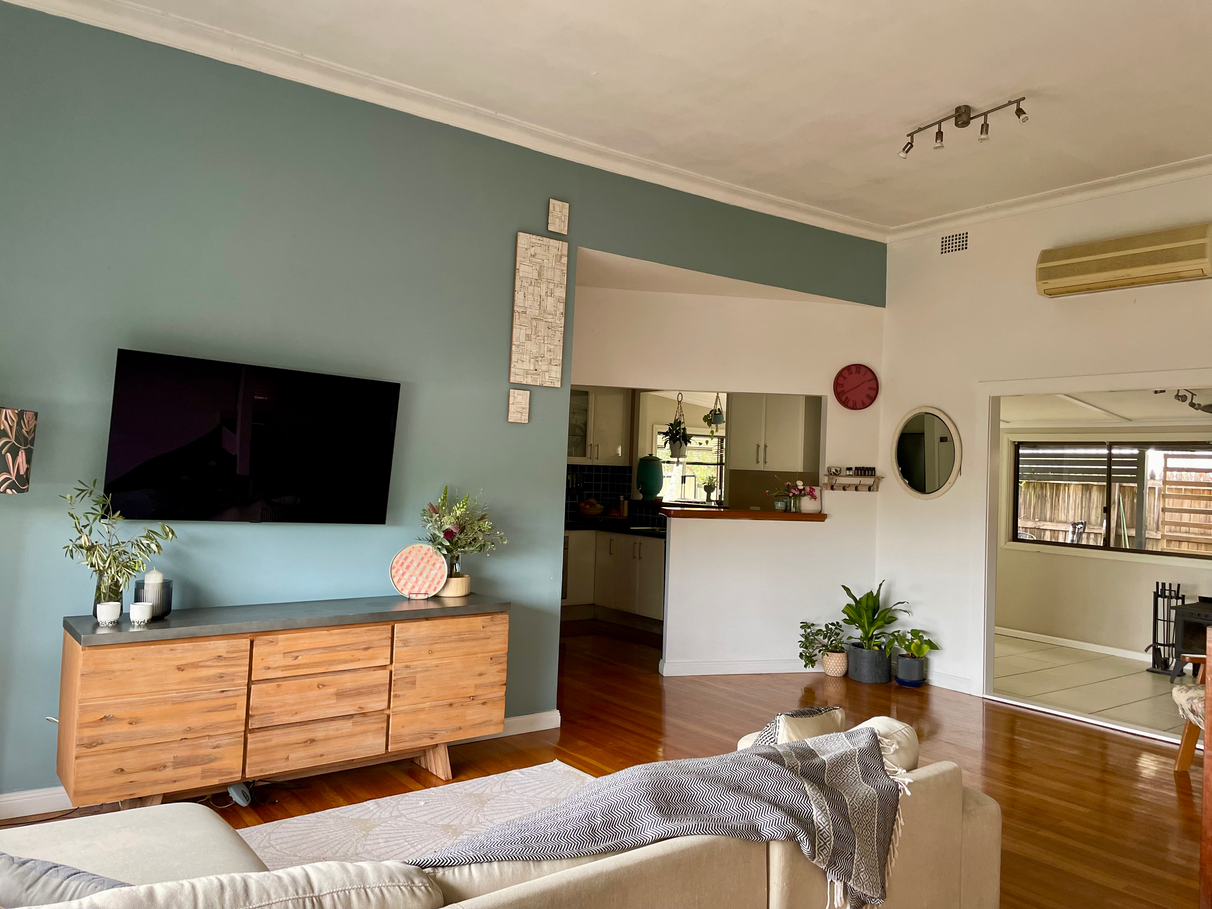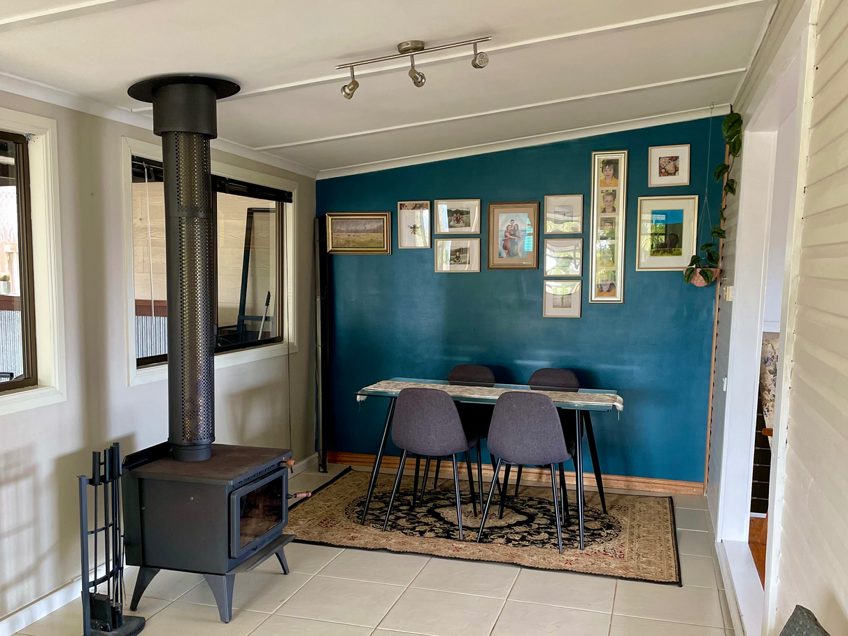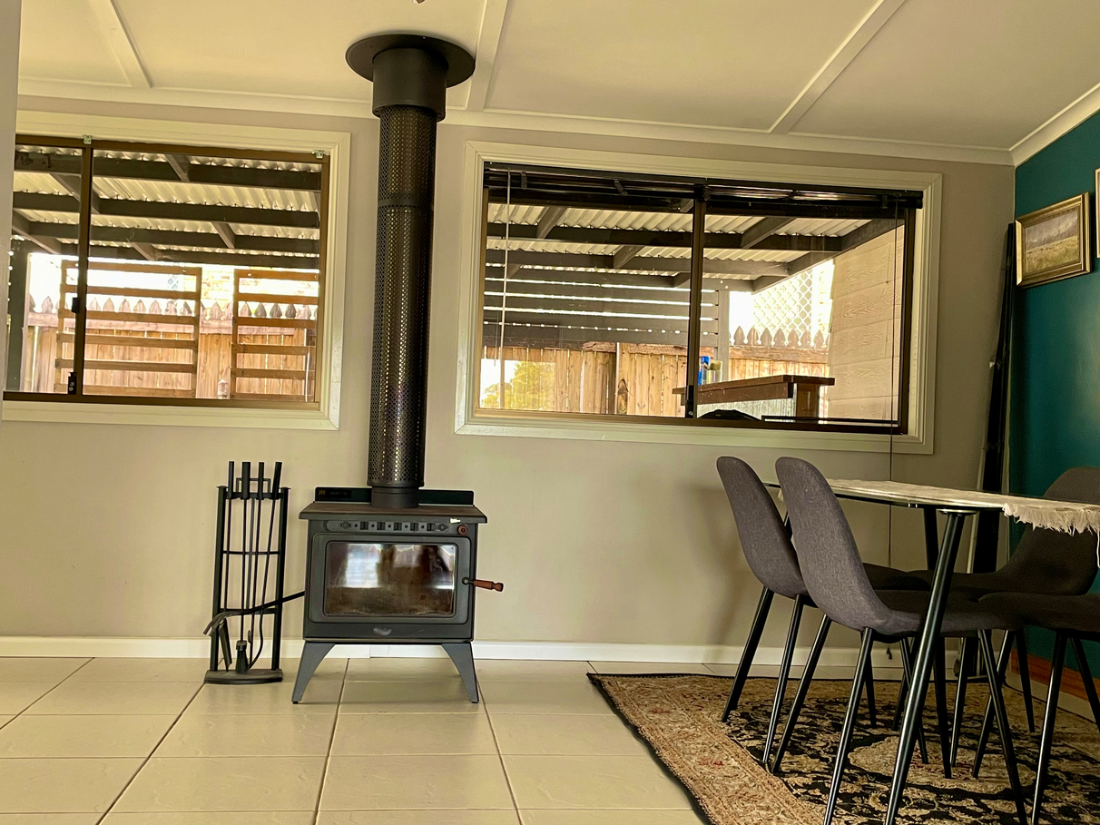The entrance to the home welcomes you with high-ceilings, open space and polished timber floors that provide warmth and character. This follows through to the dining room/sunroom which features an indoor fireplace providing the perfect romantic setting on those cold winter nights. The three bedrooms are all large in design, 2 of which are complete with large built-in wardrobes and fans. The main bedroom also features air conditioning. The modern kitchen features white cupboards with black bench tops, black splash back tiles, double sink, and stainless-steel appliances including dishwasher.