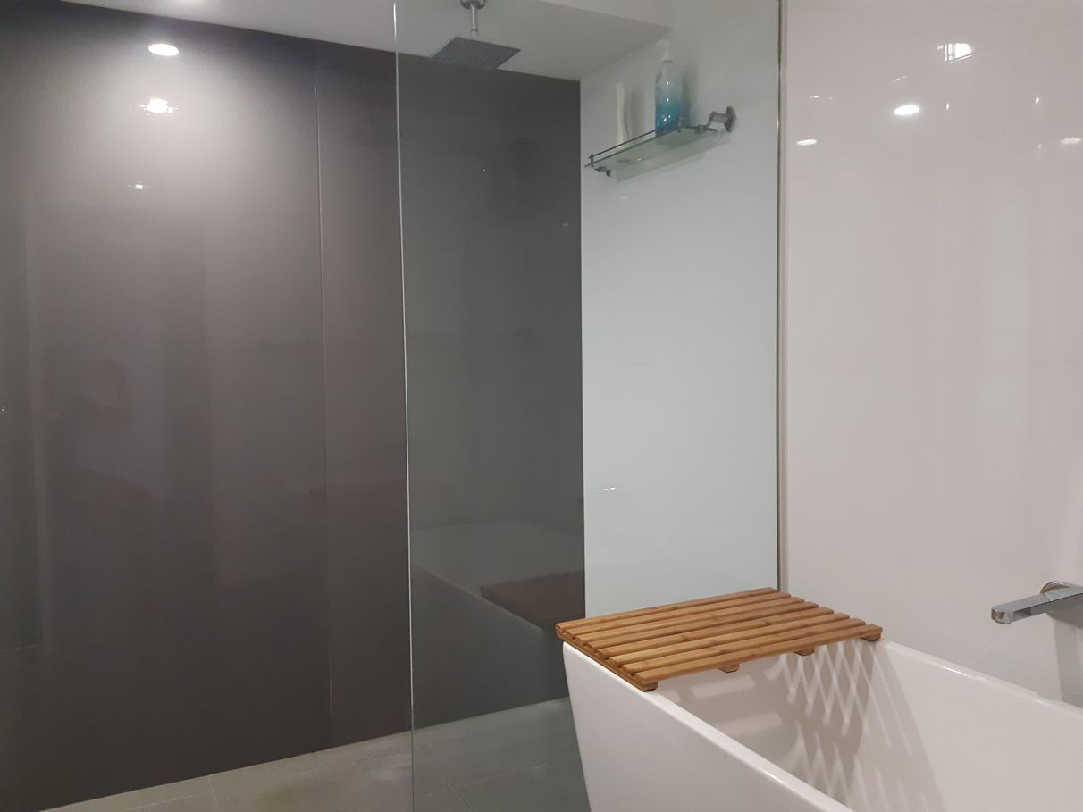 The stylish bathrooms feature custom-made vanities, floor to ceiling tiles and extensive use of frameless glass for screens and splashbacks.