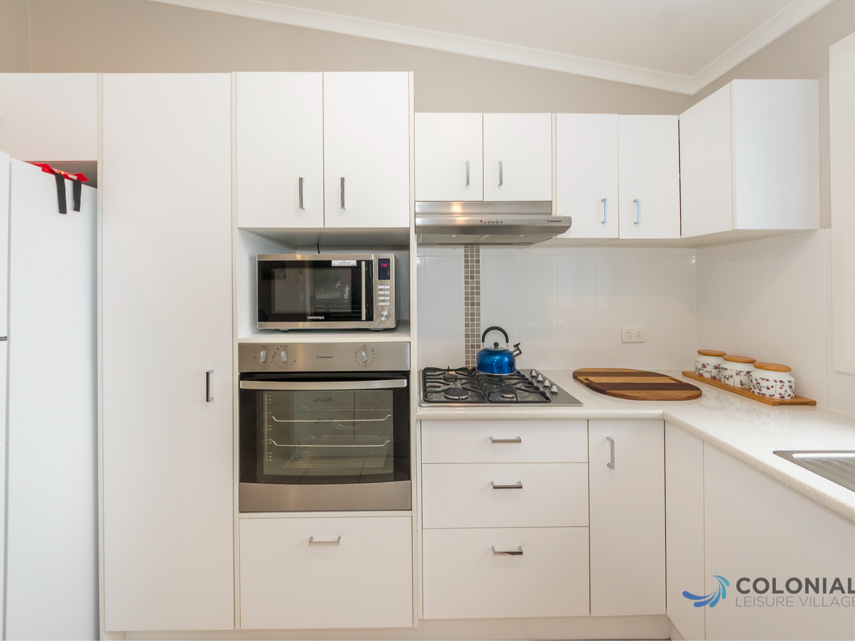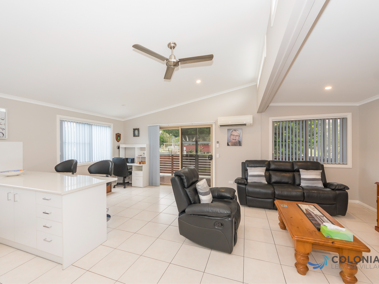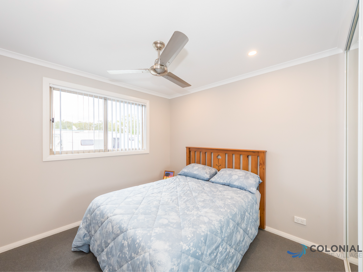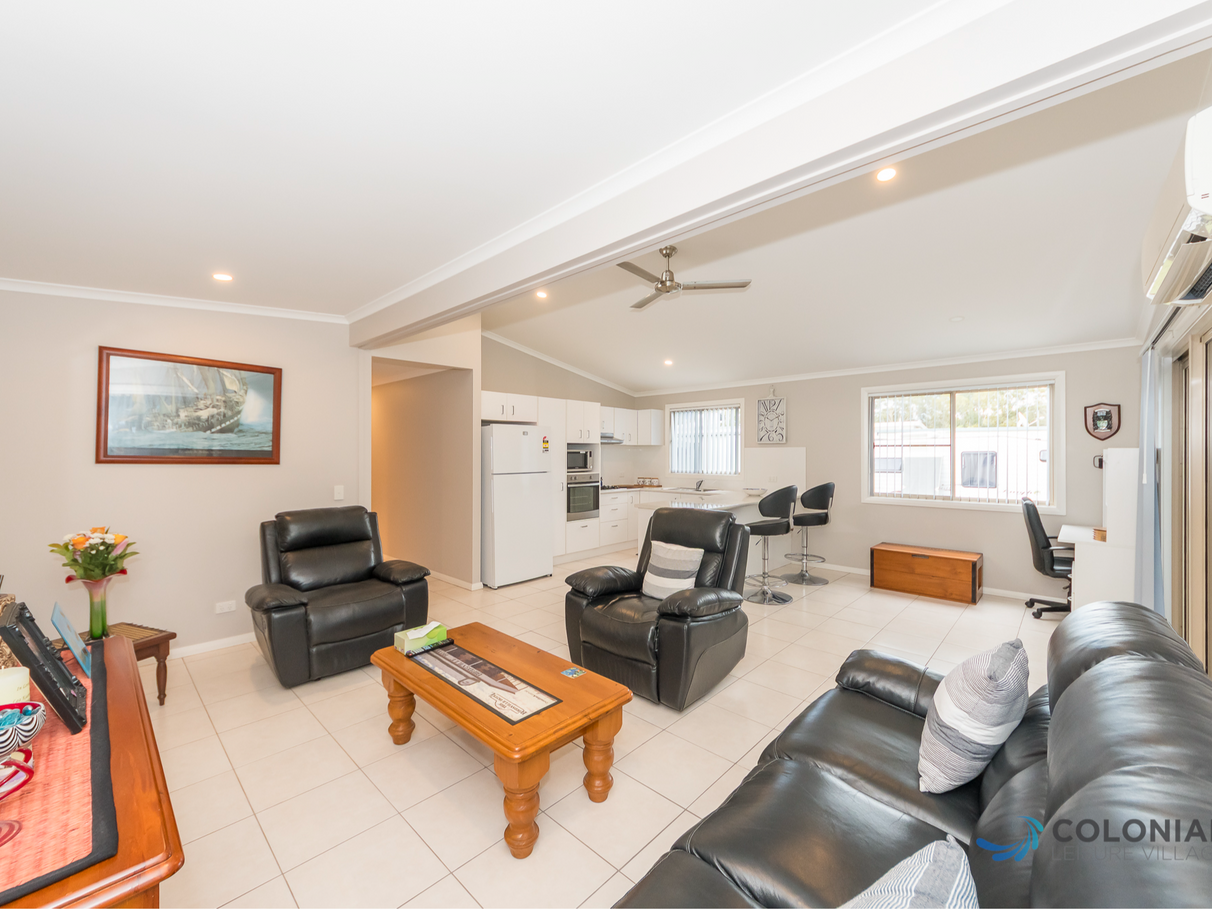 This immaculately presented relocatable home, designed and built by Uni-Plan in 2016, offers comfortable and low-maintenance living within the welcoming over-55s community of Colonial Leisure Village in Harrington. With two generous bedrooms, both featuring built-in robes and ceiling fans, the home is thoughtfully designed for relaxed, easy living in a peaceful village setting.