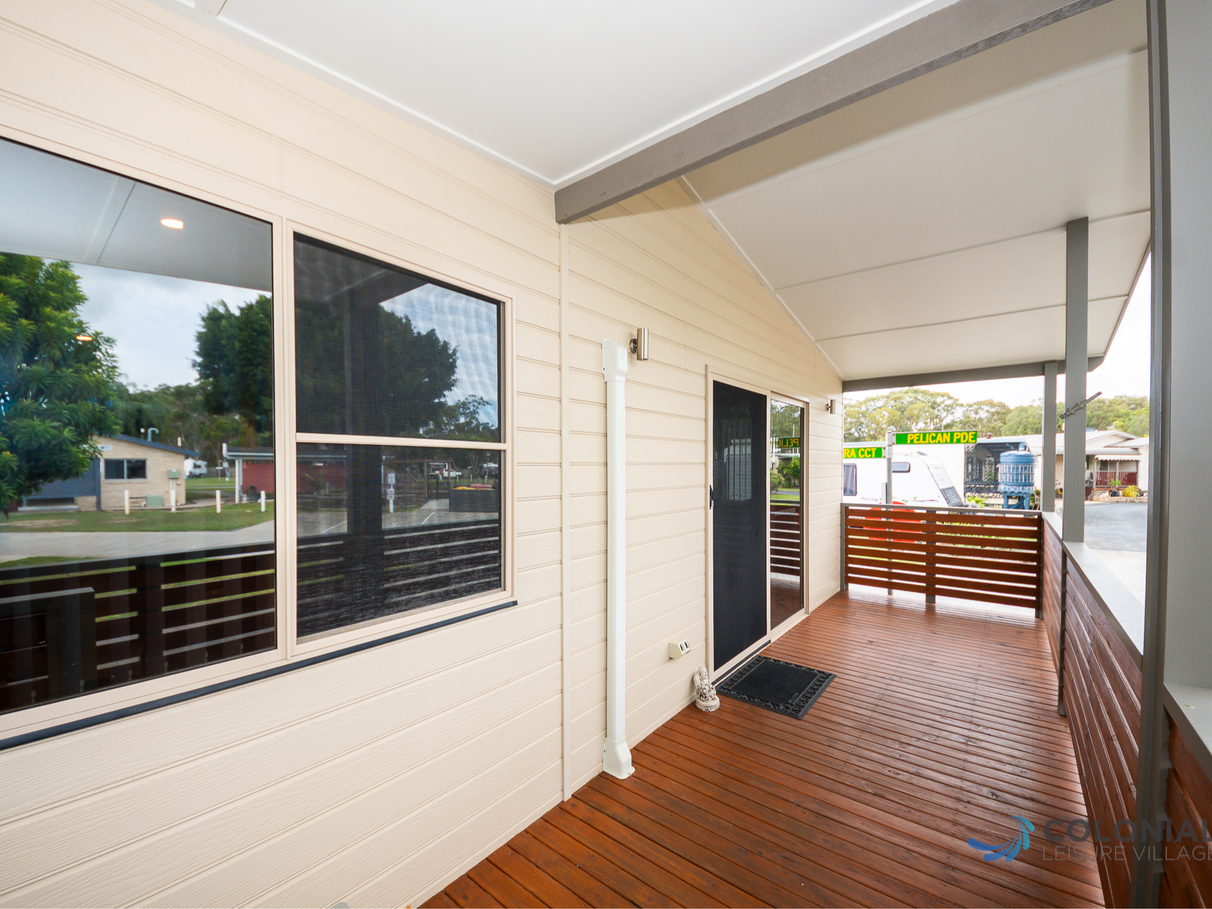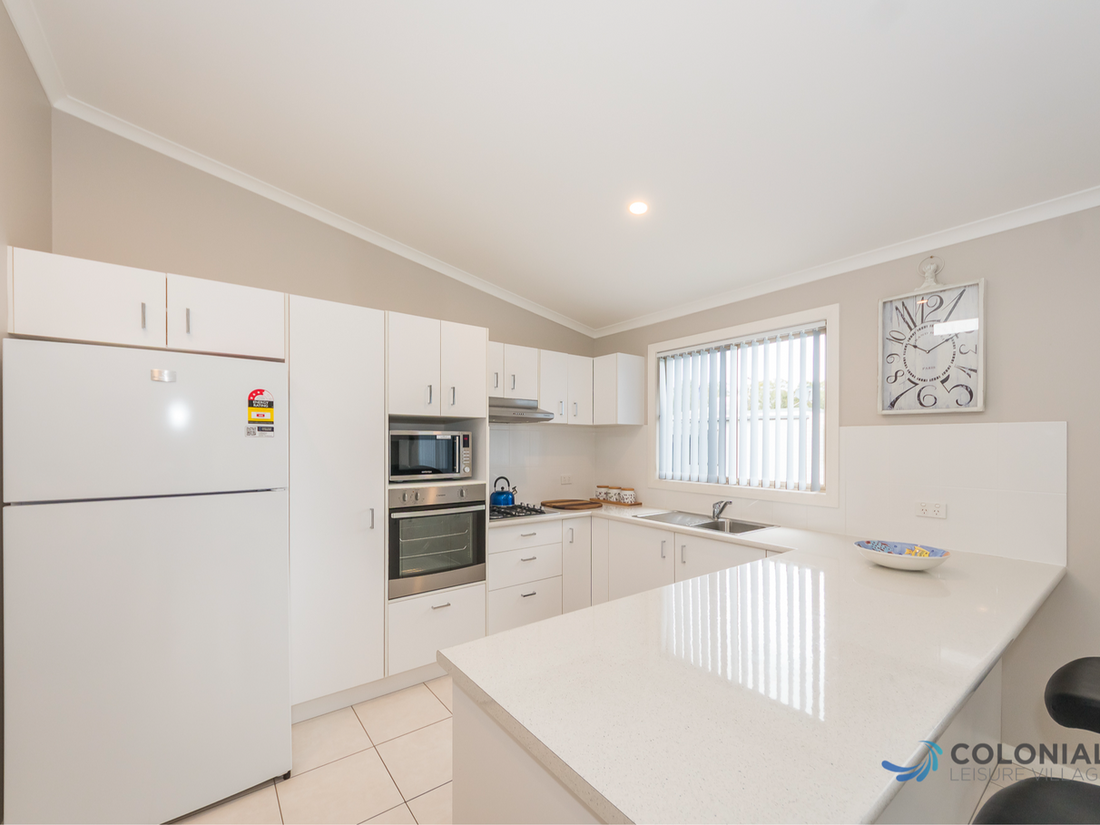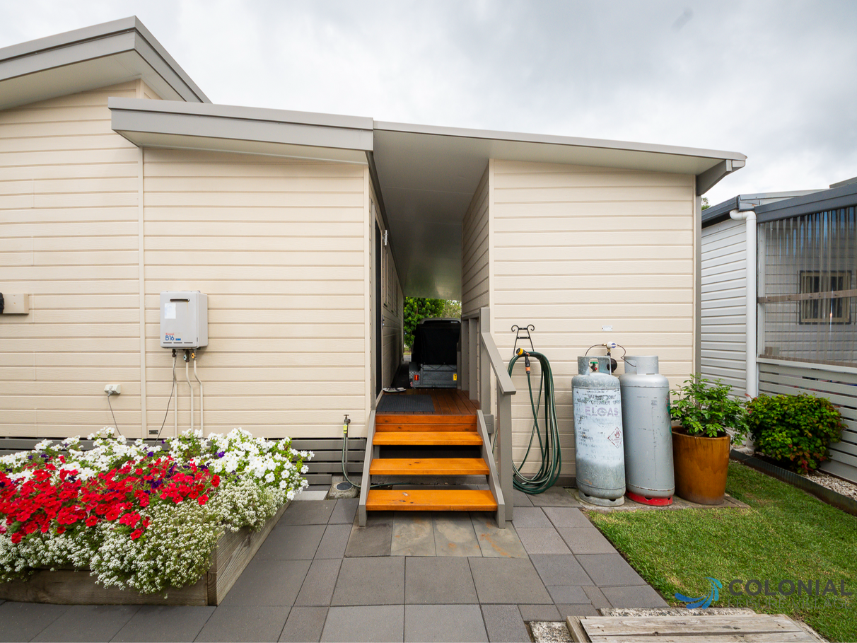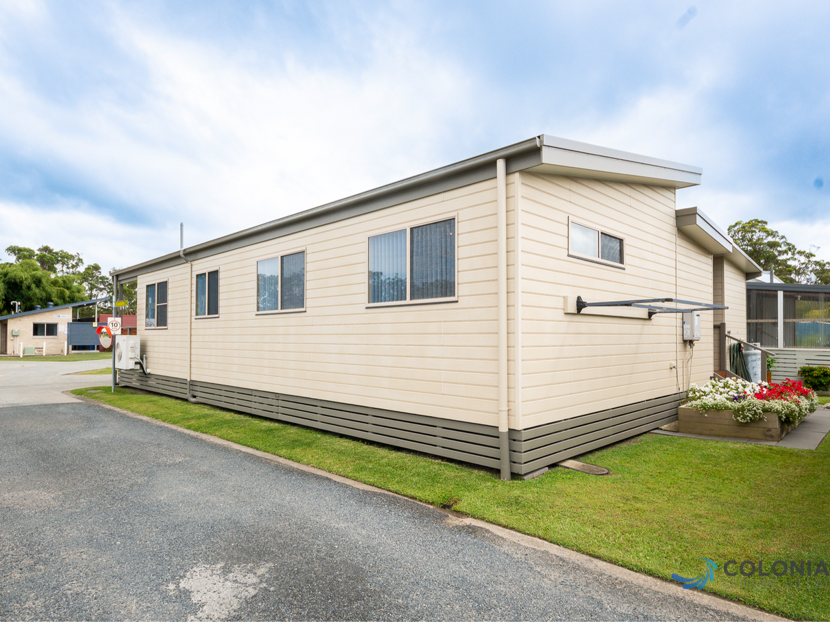 This immaculately presented relocatable home, designed and built by Uni-Plan in 2016, offers comfortable and low-maintenance living within the welcoming over-55s community of Colonial Leisure Village in Harrington. With two generous bedrooms, both featuring built-in robes and ceiling fans, the home is thoughtfully designed for relaxed, easy living in a peaceful village setting.