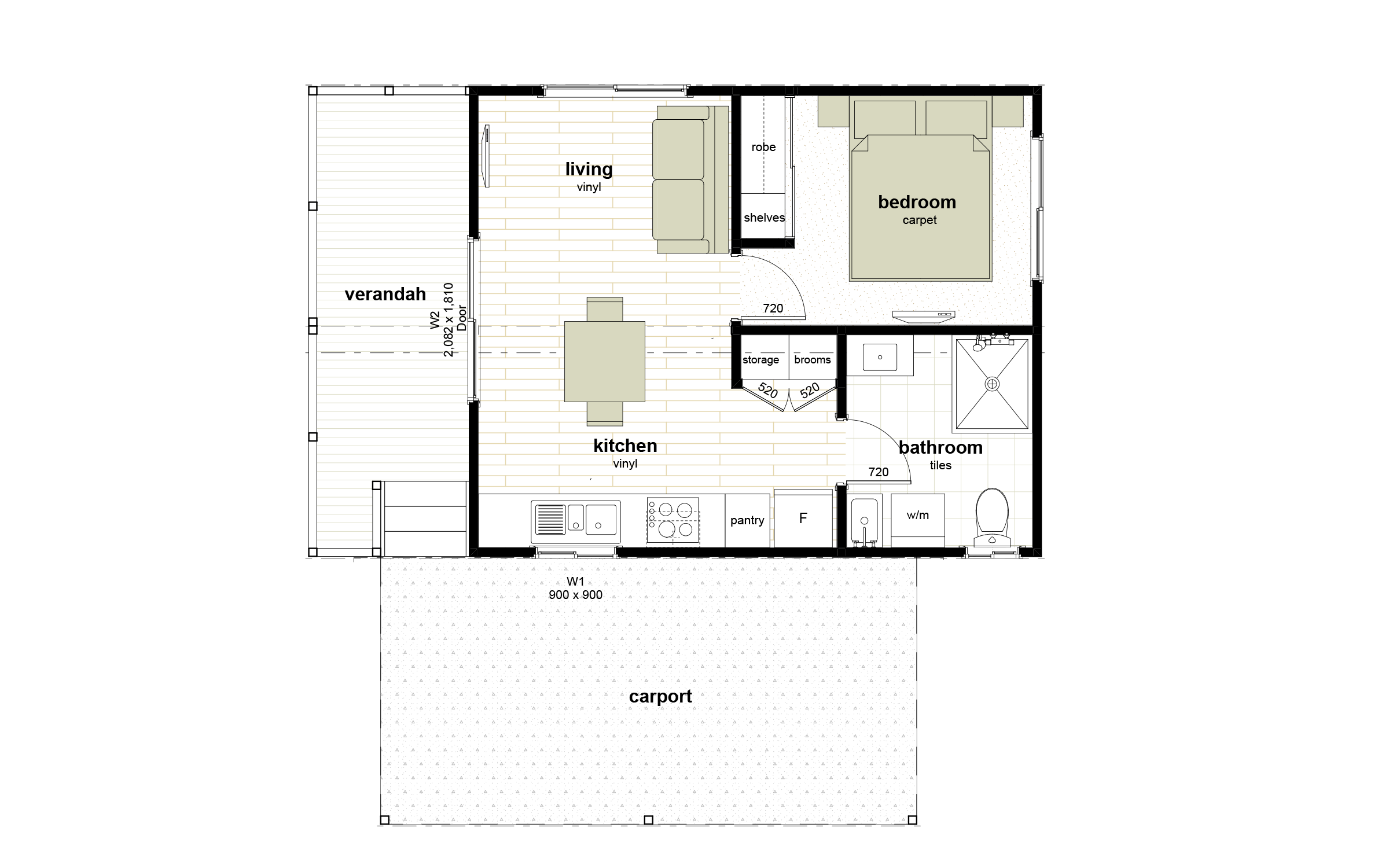 A single carpeted bedroom, with a built-in robe, sits to the rear of the home. The tiled bathroom has a shower, toilet and vanity with space for a washing machine and sink. A storage cupboard is located adjacent to the kitchen.