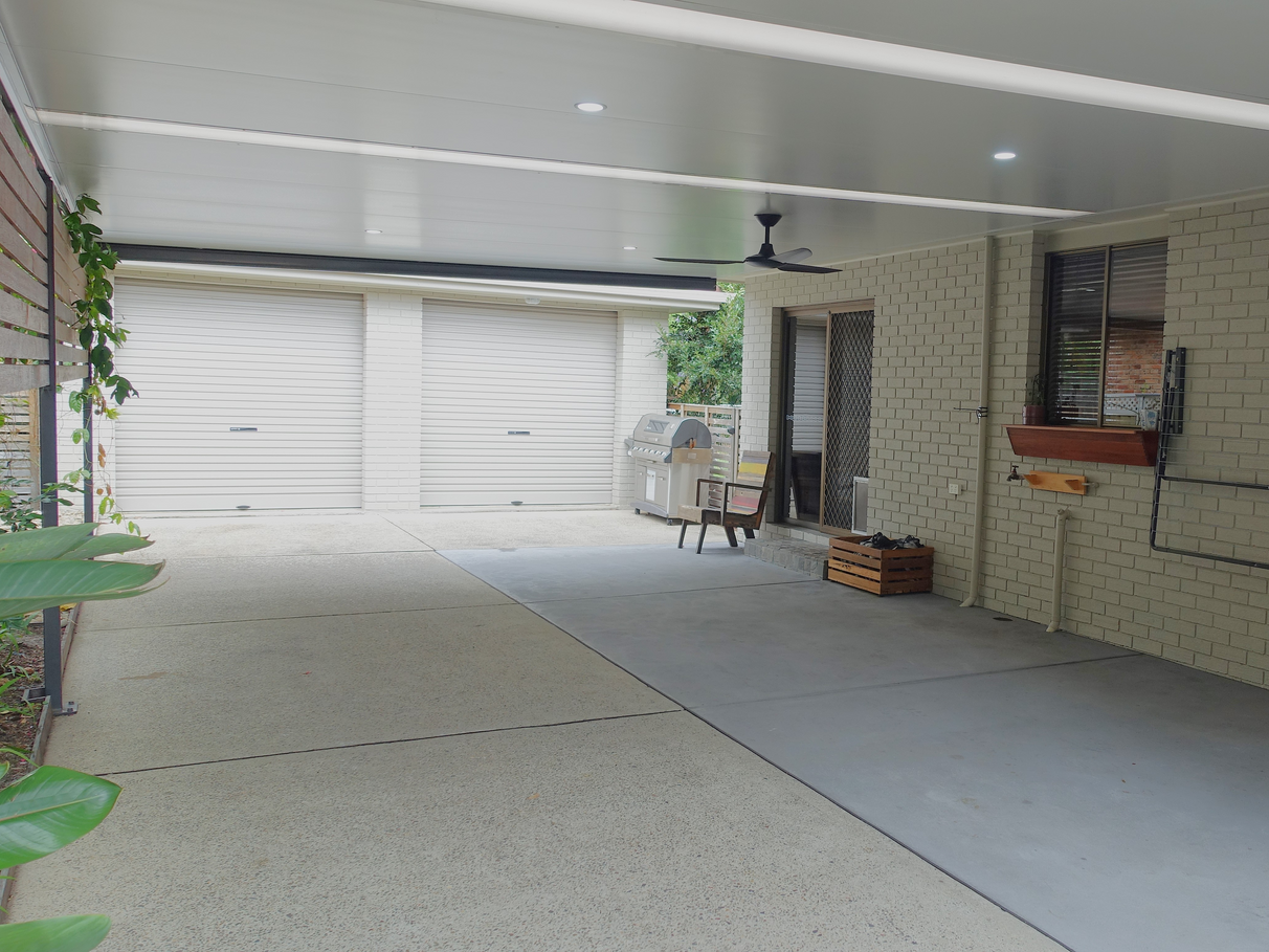 - Double garage with remote-controlled door, insulated Stratco ‘Cool Decking’ carport and electric driveway gate.