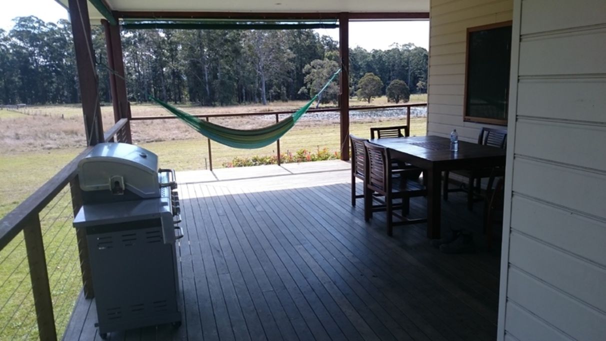 A charming four year old home situated on 100 acres only 20 minutes from Taree. Featuring 2 large bedrooms with generous built-in wardrobes. Spacious open plan living with stunning views through french doors in bedrooms and loungeroom which overlook the picturesque farmland, forest and mountains. Wide covered wrap-around verandah and large entertaining deck with direct access to the large purpose-built kitchen which boasts a granite island bench, gas cooktop, electric oven and generous pantry and cupboard space.