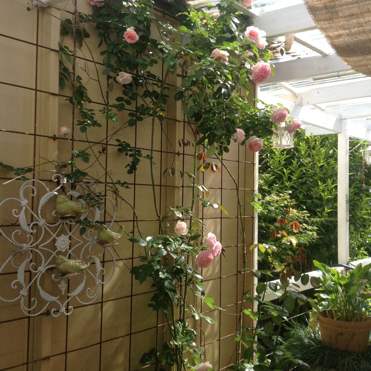 Outdoor gazebo with rose arbour, large stone table and 6 chairs, and fountain.