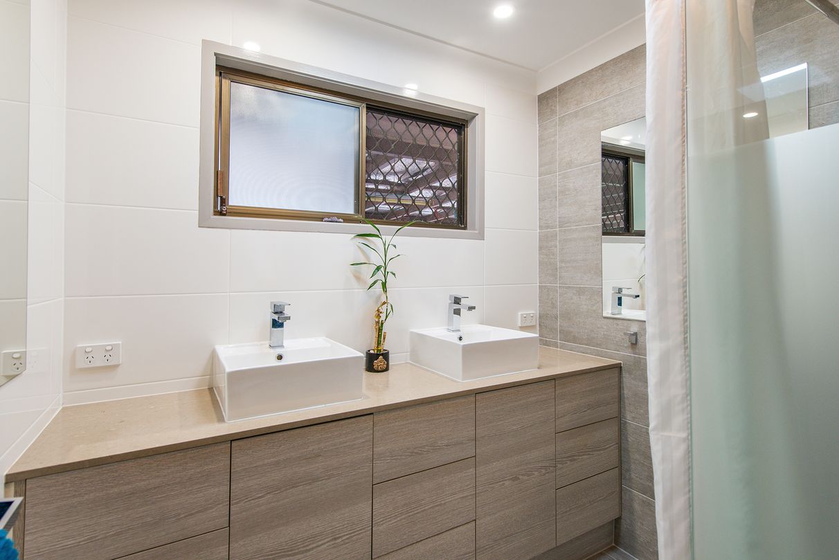 Two bathrooms - the stylish new family bathroom with full-height tiling, stone-top twin vanities, shower and separate toilet, and a second bathroom/laundry combined servicing downstairs.